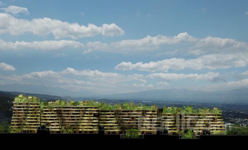 Архитектурын салбарын Нобел гэгддэг Прицкерын шагналыг хүртсэн Францын архитектор Жан Нювел уг барилгыг бүтээжээ. Aquarela нь 650 айлын орон сууцны хороолол юм. Хэдийгээр энд хэд хэдэн тусдаа есөн давхар барилгууд байх боловч урт тагтнууд тэдгээрийг хооронд нь холбосноор барилгын бүтээн байгуулалтыг нүсэр том болгож харагдуулах ажээ. Чулуун өнгөлгөө, цонхны модон хаалт болон гаднах ногоон хийц нь байгууламжид бүс нутгийн зэрлэг, уулархаг газрын хэв маягийг шингээхийн зэрэгцээ оршин суугчдад байгальтай ойр мэдрэмжийг төрүүлэхэд нөлөөлөх юм.