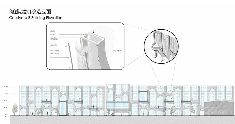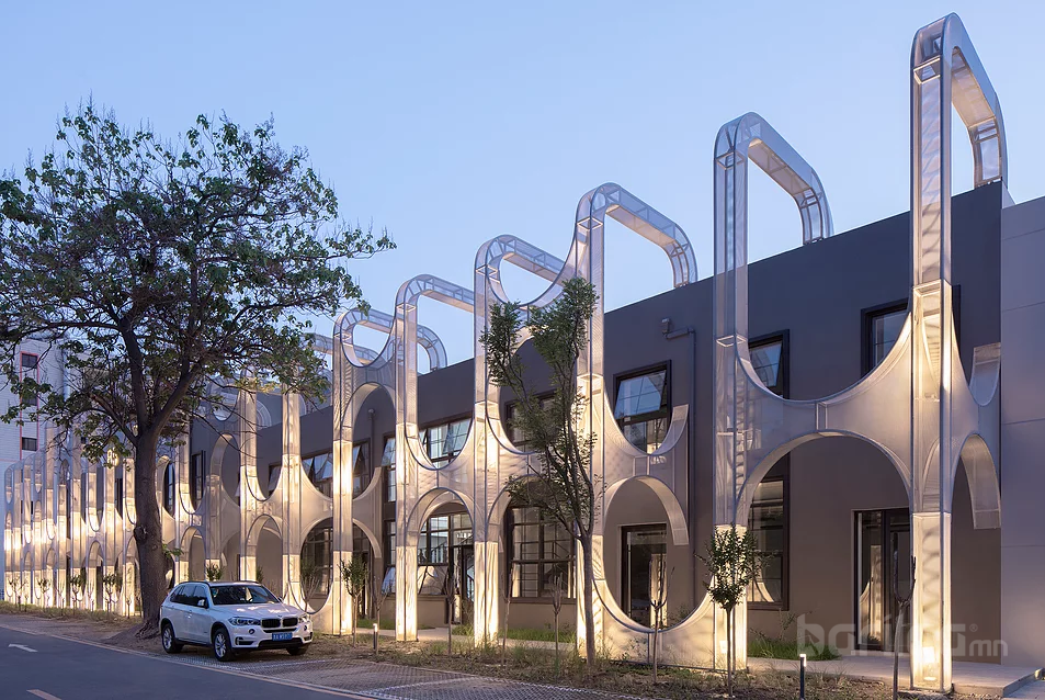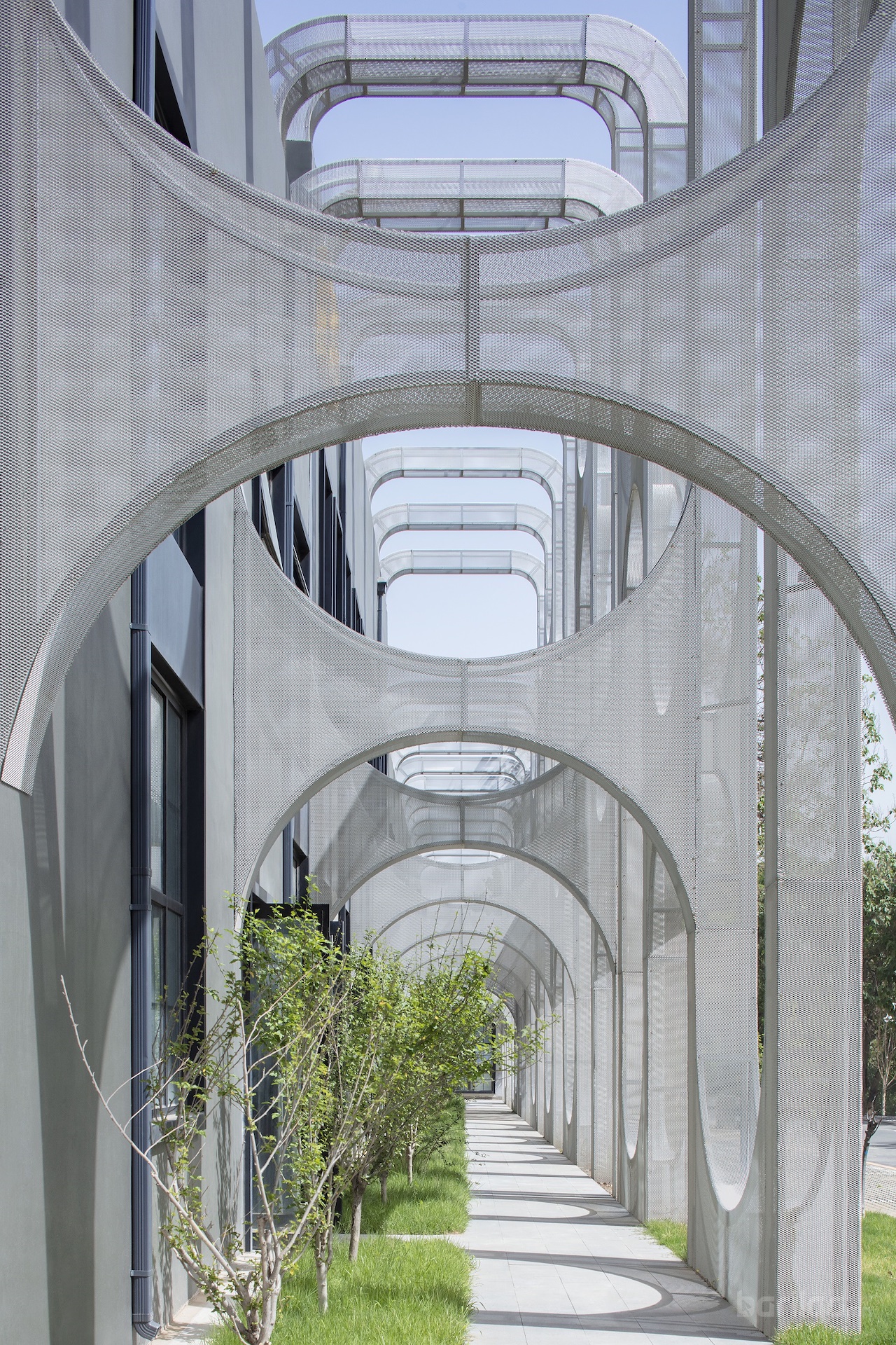 Аж үйлдвэрийн уян төмөр торыг ашиглах нь сонгодог архитектурын тогтоцуудын хатуу геометрийн зөөлөн мэдрэмжийг өгдөг. Шөнө, өдрийн хооронд өөр өөрөөр харагдах тор нь өдрийн цагаар хатуу, энгийн харгадаж, бүс нутгийн тодорхойлдог бол шөнийн цагаар арын гэрэлтүүлэгтэй тор нь даавуун дундуур дээши доош чиглэн тасралтгүй оёсон шугам болон гэрэлтдэг. Геометрийн нуман хаалга, ландшафтын эргэлт нь цааш үргэлжлэх зурвасын төгсгөлийг эргүүлж харуулах бөгөөд ингэснээр барилга нь тодорхойлогч болж, доторх болон гаднах үйл ажиллагааг ялгааг илэрхийлдэг.