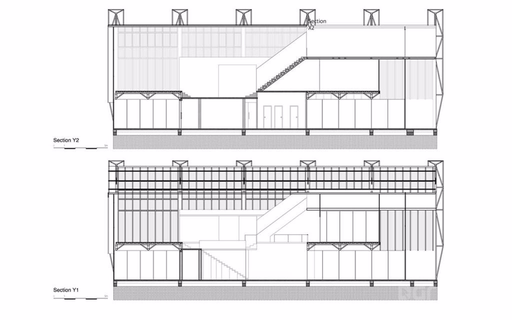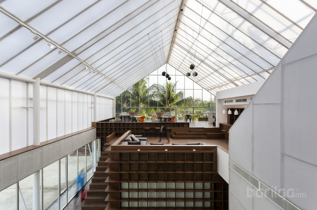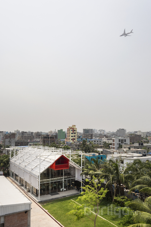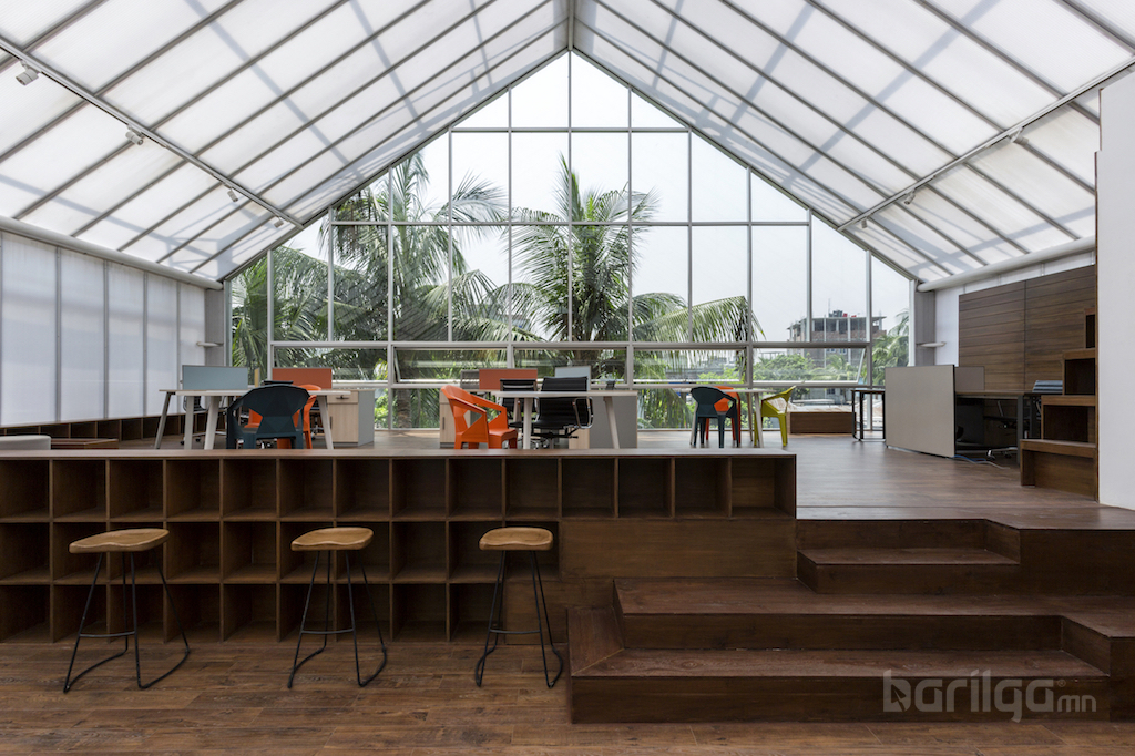 Бангладешийн Dehsar Works архитектурын компани агуулахын зориулалттай ашиглаж байсан байгууламжийг оффис болгон өөрчилжээ. Тус компани харилцаа холбооны Бангладешийн нийслэл Дака хотод байрлах The Blues Communications компанийн оффисын зураг төслийг хариуцан ажилласан байна. Dehsar Works 30-40 хүний багтаамжтай тус оффисын зураг төслийг хуучин агуулахыг сэргээн засварлаж хийжээ. The Blues Communications компани энэ ажлыг хайрцагнаас гарч сэтгэсэн, алсын хараатай, бүтээлч архитектур гэж үзэж байгаа аж.