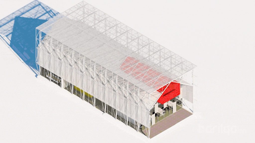 Барилга угсралтын тухайд бэлэн хийцийн метал экзоскелет ашиглаж, дулаалгын зорилгоор поликарбонат хавтанг ашиглажээ. Түүнчлэн гадна, дотор талын дулаан алдалтыг багасгах зорилгоор давхар бүрхүүлтэй шилэн фасад хийжээ. Мөн төмөр бетонон нийлмэл хавтангаар шаллаж, бэлэн хийцийн модон хавтангаар гадар талыг нь хийсэн байна. Түүнчлэн төмөр бетон болон тоосгыг метал экзоскелетийг бэхлэх зорилгоор ашиглажээ.