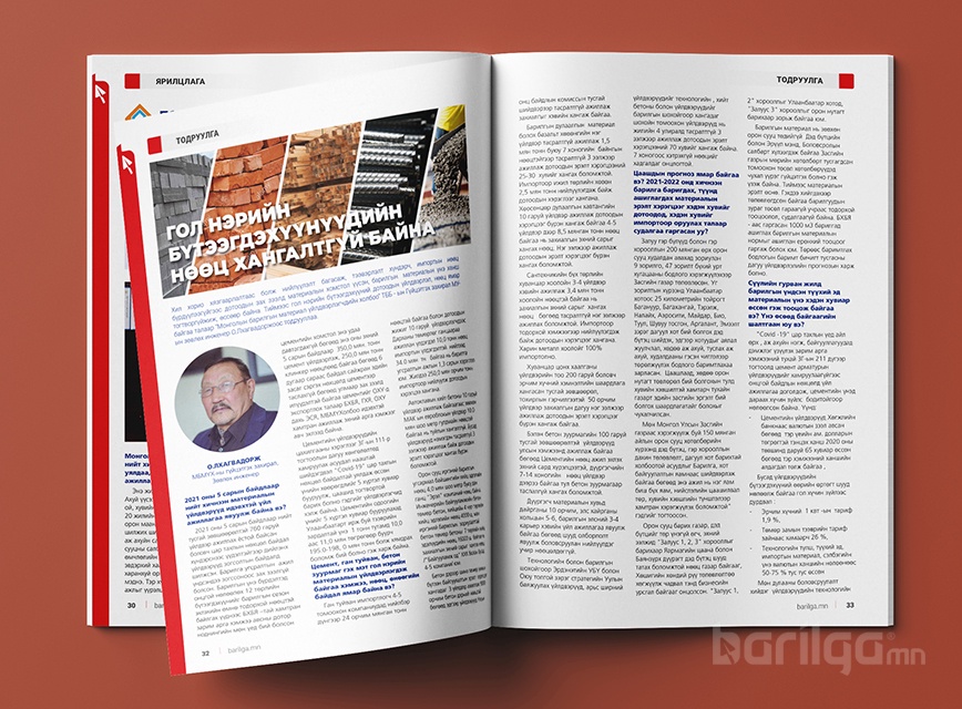 Сар тутмын Барилга МН сэтгүүлийн 133 дахь дугаар хэвлэгдэн гарч эрхэм захиалагч, уншигч таны гарт очиход бэлэн боллоо. Барилга МН сэтгүүлийн дугаар бүрт тогтмол гардаг ярилцлагын булан, төрөл бүрийн судалгаа, салбарын тулгамдаж буй асуудлын хүрээн дэх нийтлэл, мэргэжилтнүүдийн зөвлөгөө, иргэдэд зориулсан булан болон амины орон сууцны төрөл бүрийн мэдээлэл, шинэ орон сууц, барилгын гол нэрийн материалын үнэ ханш нийтлэгддэг билээ.