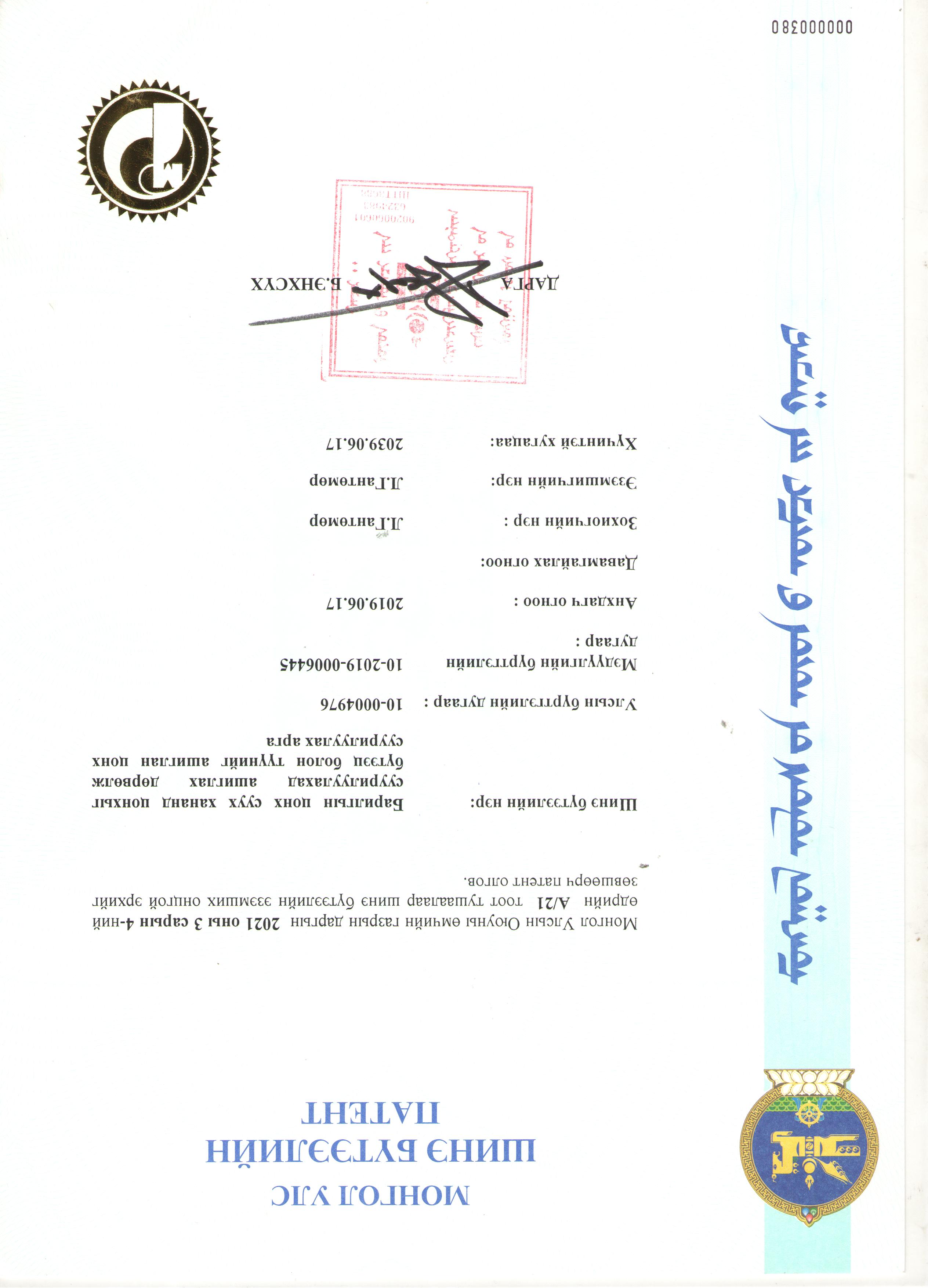Барилгын хананд цонх угсарч суурилуулах давхар суулгалтын энэхүү шинэ аргаа бид МУ-ын Оюуны өмчийн газарт 2019 оны 06 дугаар сарын 17-ны өдөр бүртгүүлж, 10-0004976 тоот улсын бүртгэлийн дугаартай “Шинэ бүтээлийн патент”-ийг хүлээж авсан байгаа.