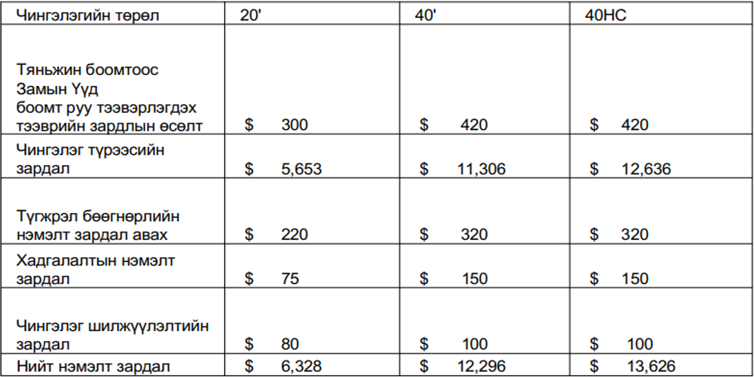 Тяньжин боомтоос Улаанбаатар хүртэл тээвэрлэгдэх тээврийн зардлын өсөлт | $ 540 | $ 710 | $ 710 |
