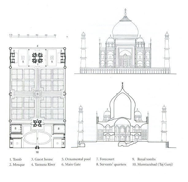 Байгууламжийг Европ урчууд барьсан гэж зарим судлаачид үздэг ч уран барилгачин нь Ustad Ahmad байсан талаарх баримт олон байдаг байна. Мөн Ислам болон Хинди шашны элементийг уг байгууламжид хослуулсан байна. Бөмбөгөр оройн голч нь 18 м бөгөөд байгууламжийн суурь тавцан нь дөрвөлжин хэлбэртэй хааш хаашаа 95 м-ээс урт байна. Таж Махал нь ертөнцийн 7 гайхамшгийн нэг юм.