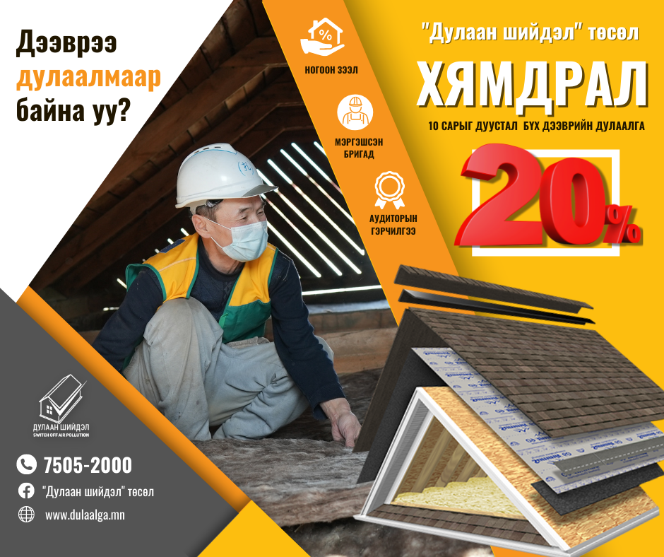 Хүйтний улирал ирж буй энэ цаг үед Улаанбаатар хотын хувийн орон сууцтай айлуудад зориулж "Дулаан шийдэл" төсөл дээврийн дулаалгадаа 20 хувийн хямдралыг зарлаад байна.