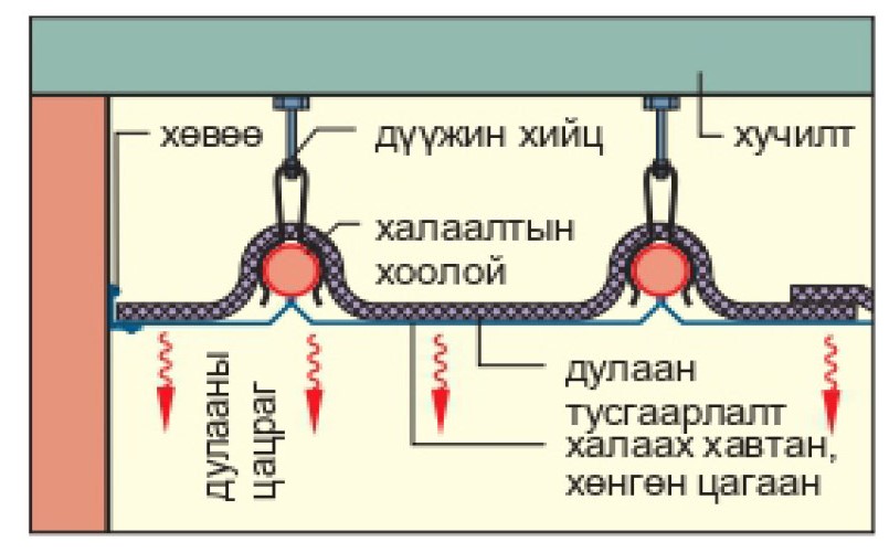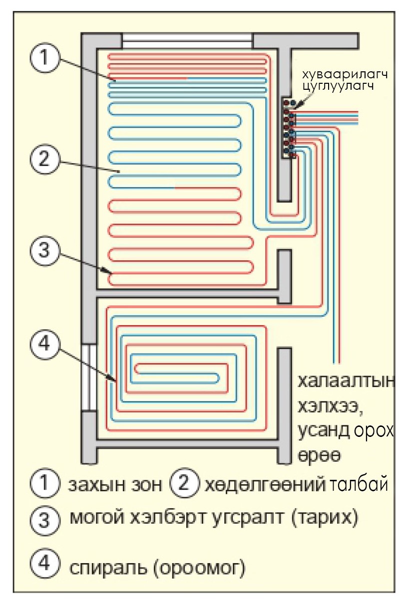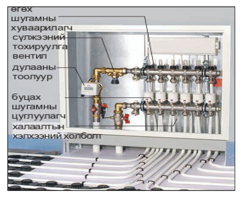 Тиймээс дамжуулан холбосон халаах хэрэгсэлийн тоог 7-оор хязгаарладаг байна. Орон сууцны дотор талд хуваарилах хайрцаг (хуваарилах щит)-наас гарах халаалтын шугамуудыг шалны өнгөлгөө үеийн дотор тавьж халаах хэрэгсэлүүд рүү өгдөг.