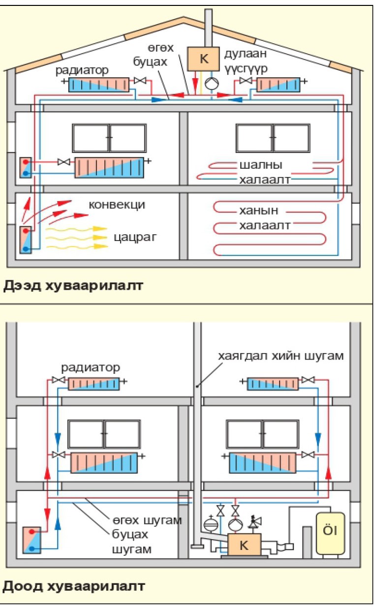 Дулаан хуваарилалтын системд нэг хоолойн эсвэл хоёр хоолойн системийг ашигладаг. Халаалтын зуухийг суурилуулсан байрлалаас хамааруулан доороос хуваарилах, дээрээс хуваарилах гэж хоёр ангилдаг.