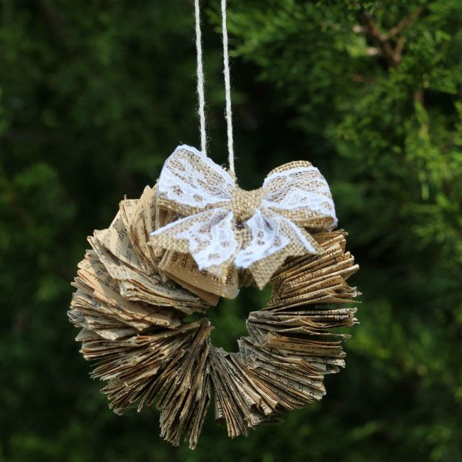 Хэрвээ танд хэзээ ч дахиж уншихгүй эсвэл хуучирч урагдсан ном байгаа зурган дээр шиг шинэ жилийн хаалга болон хананд өлгөдөг чимэглэл хийгээрэй. Зузаан утсан уяанд номын хуудсыг сүвлэж хийгээд л бэлэн болно. Дараа өөрийн хүссэн чимэглэлээ нэмж хийж болно.