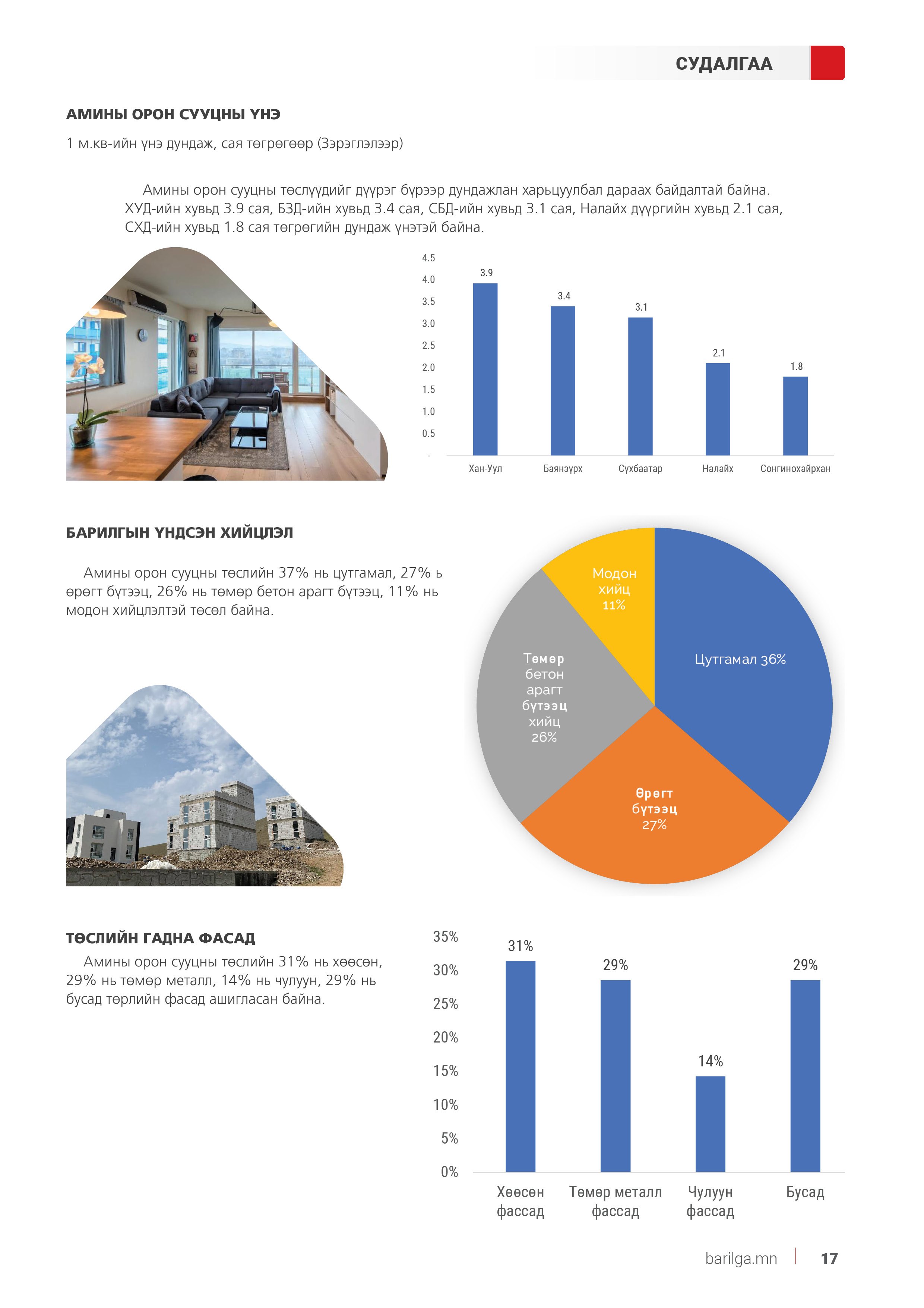 Улаанбаатар хотод баригдаж байгаа шинэ орон сууц /ШОС/ - ны судалгаа, тооллогыг Барилгын хөгжлийн төв болон Барилга МН хамтран хийж гүйцэтгээд байгаа бөгөөд судалгааны үр дүнг цувралаар танилцуулж байгаа билээ. Өмнөх дугааруудад Шинэ орон сууцны нийлүүлэлт, үнэ ханш болон Барилгын хийцлэл, чанарын талаарх судалгааг нийтэлсэн бол энэ удаад Амины орон сууцны зах зээлийн судалгааг хүргэж байна.