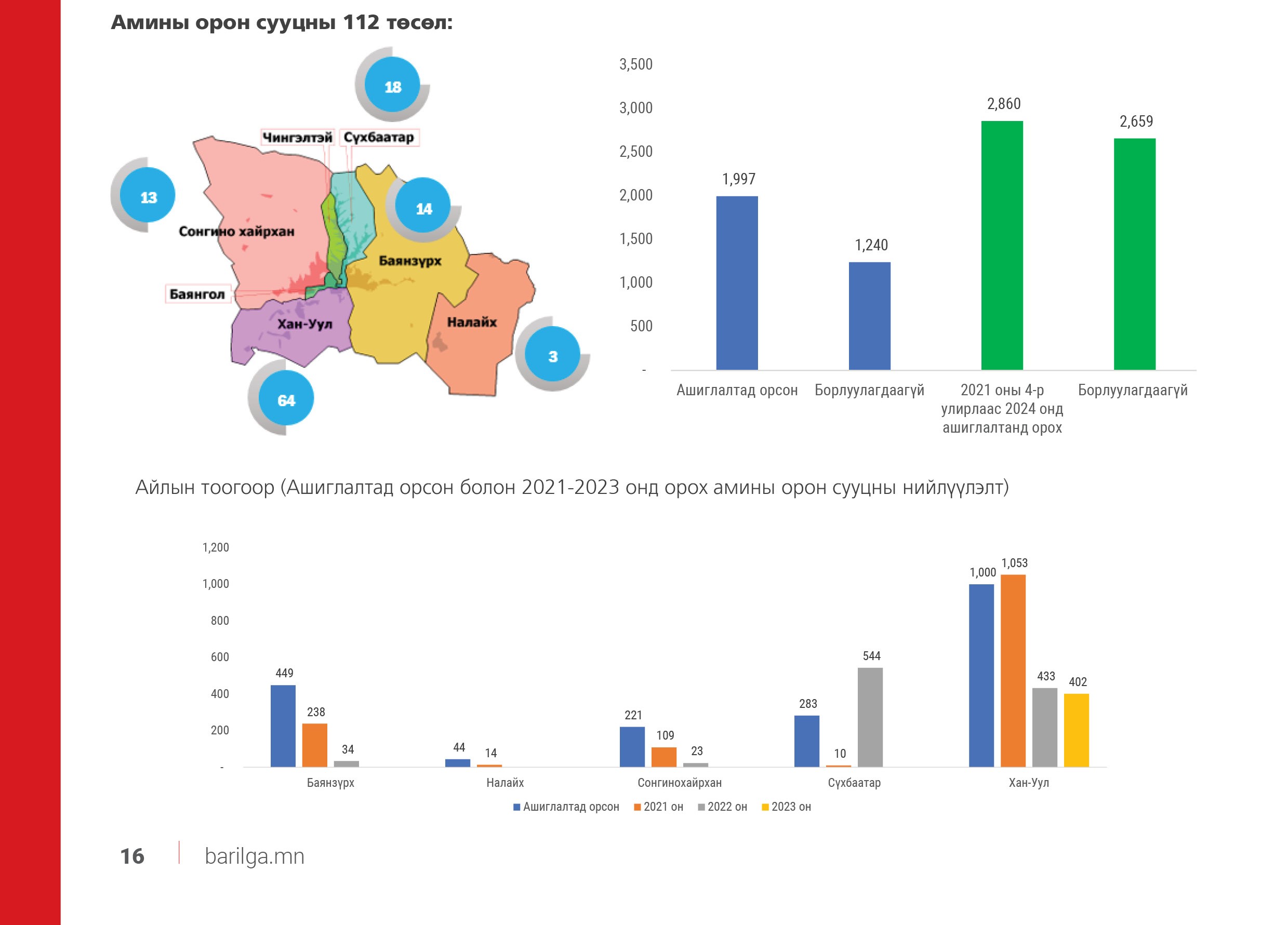 Амины орон сууцны ашиглалтад орсон 112 төслийн ашиглалтад орсон 1,997 айлын амины орон сууц байна, үүнээс 1,240 айлын амины орон сууц борлуулагдаагүй байна. 2021 оны 4-р улирлаас 2023 онд ашиглалтад орох захиалга авч буй 2,860 айлын орон сууц байгаагаас борлуулагдаагүй 2,659 айлын амины орон сууц байна.