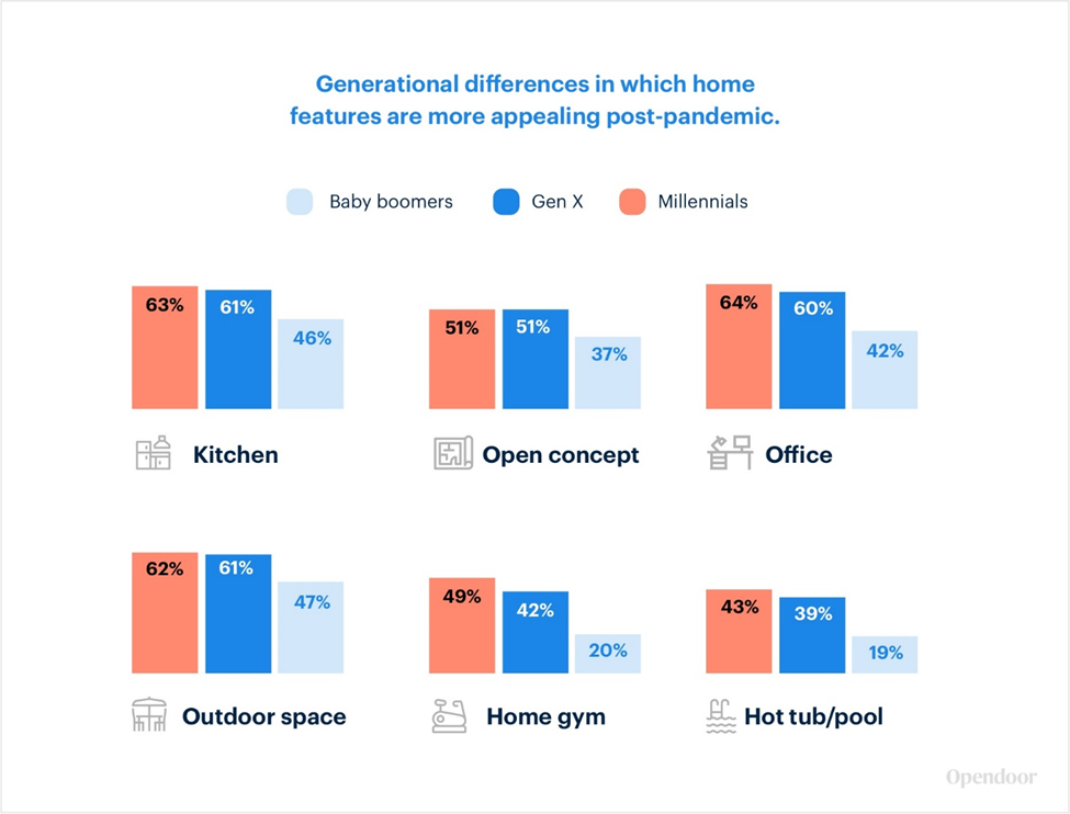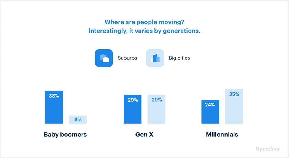 Opendoor-ын Үндэсний үл хөдлөх хөрөнгө ба хэрэглэгчийн чиг хандлагын тайлангийн дагуу худалдан авагчдын 32 орчим хувь нь пандемикийн улмаас хотын төвөөс захын хороолол амьдрахаа сонгоход нөлөөлсөн байна. Мянганыханы 35% нь том хот руу нүүхээр төлөвлөж байгаа гэж хэлсэн бол бүүмерсийн 33% нь захын дүүрэг гэж хариулжээ. Мөн шинэ амьдран суух орон байр, сууц авах шалтгааны хамгийн түрүүнд ковид-19-н улмаас амьдралын хэв маягаа өөрчлөх шаардлагатай болсон гэж судалгаанд хариулсан байв.