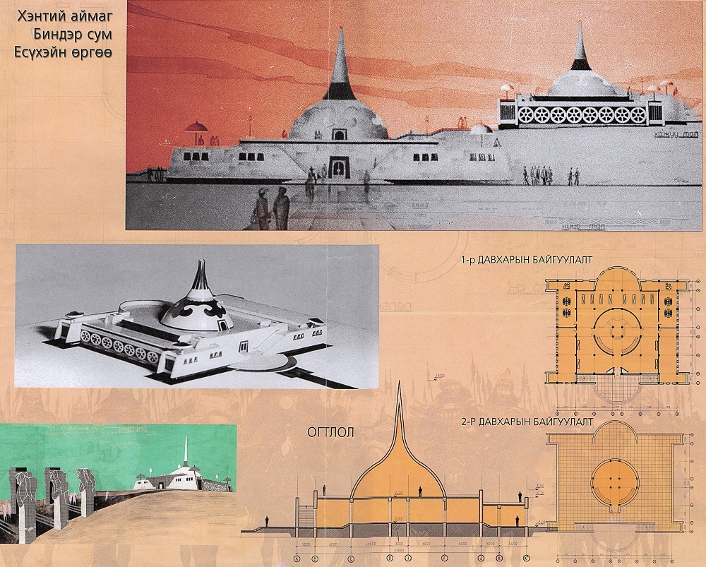 Харин VIII-IХ зуунд Уйгарын хаанчлалын үеийн Нийслэл хэмээн нэрлэгдсэн “Хар балгас” болон Чингисийн байлдан дагуулалтын үеийн Татаруудын бэхлэлтийн “чулуун хэрэм” зэрэг өөр нэгэн төрөл хэлбэр Монголын архитектурт нэвтэрснийг цогцолборын төслийн санаанд үндэслэл болгосон тал бий.