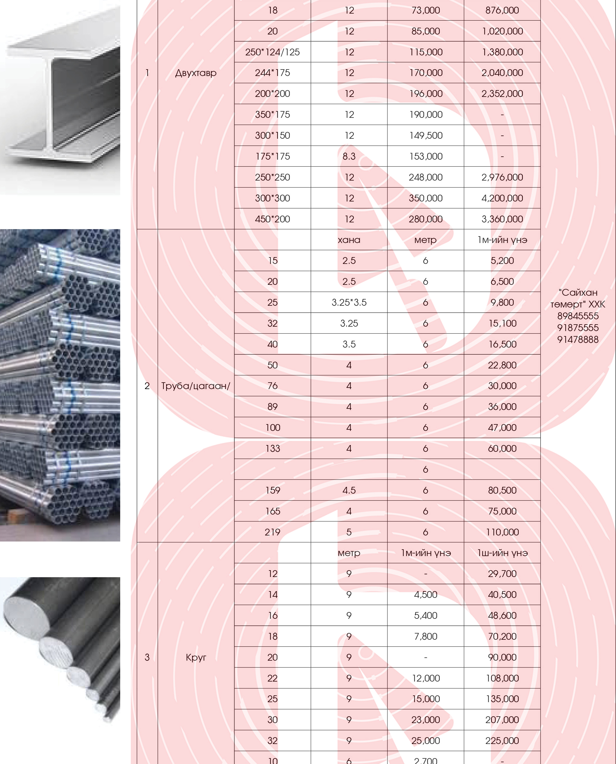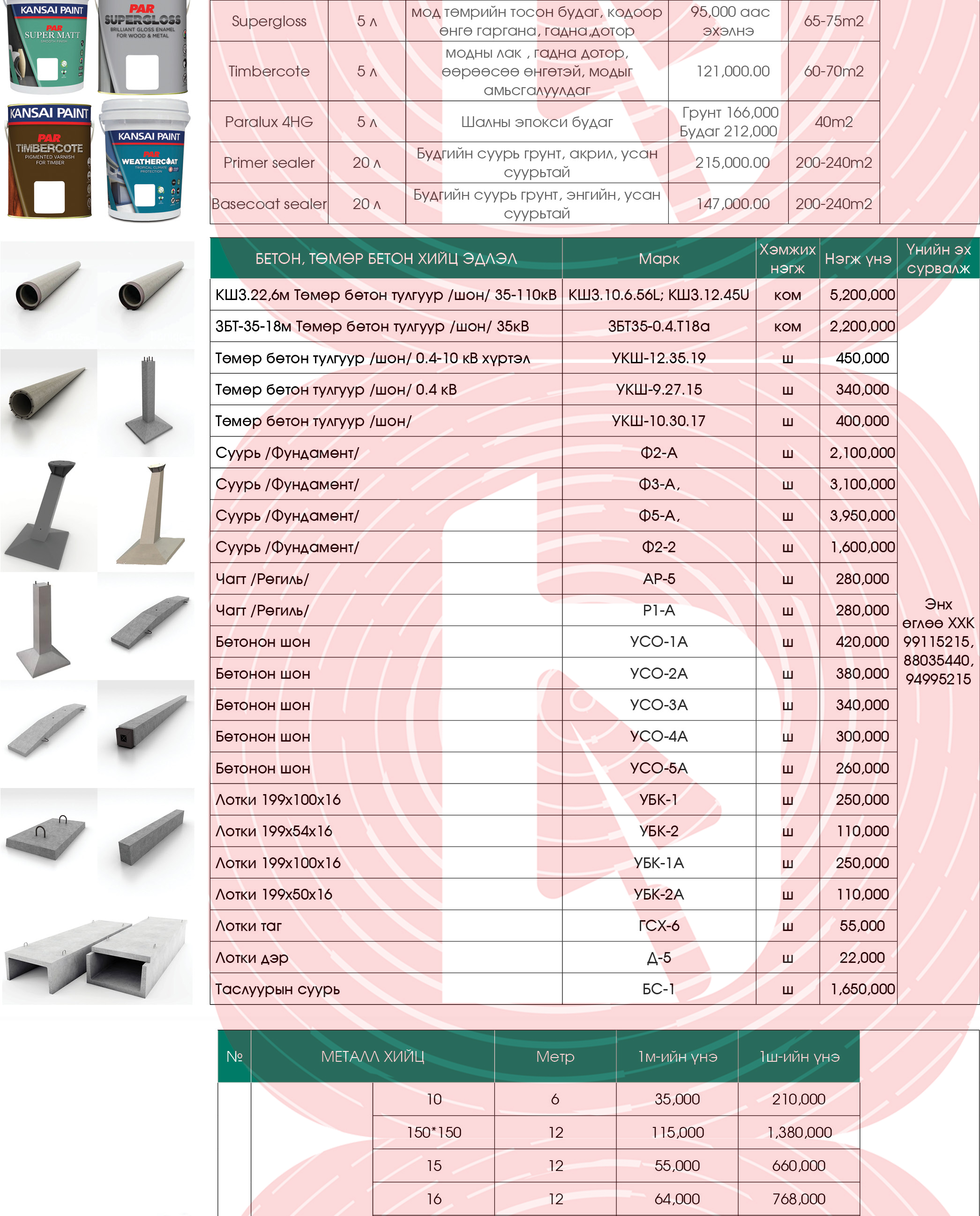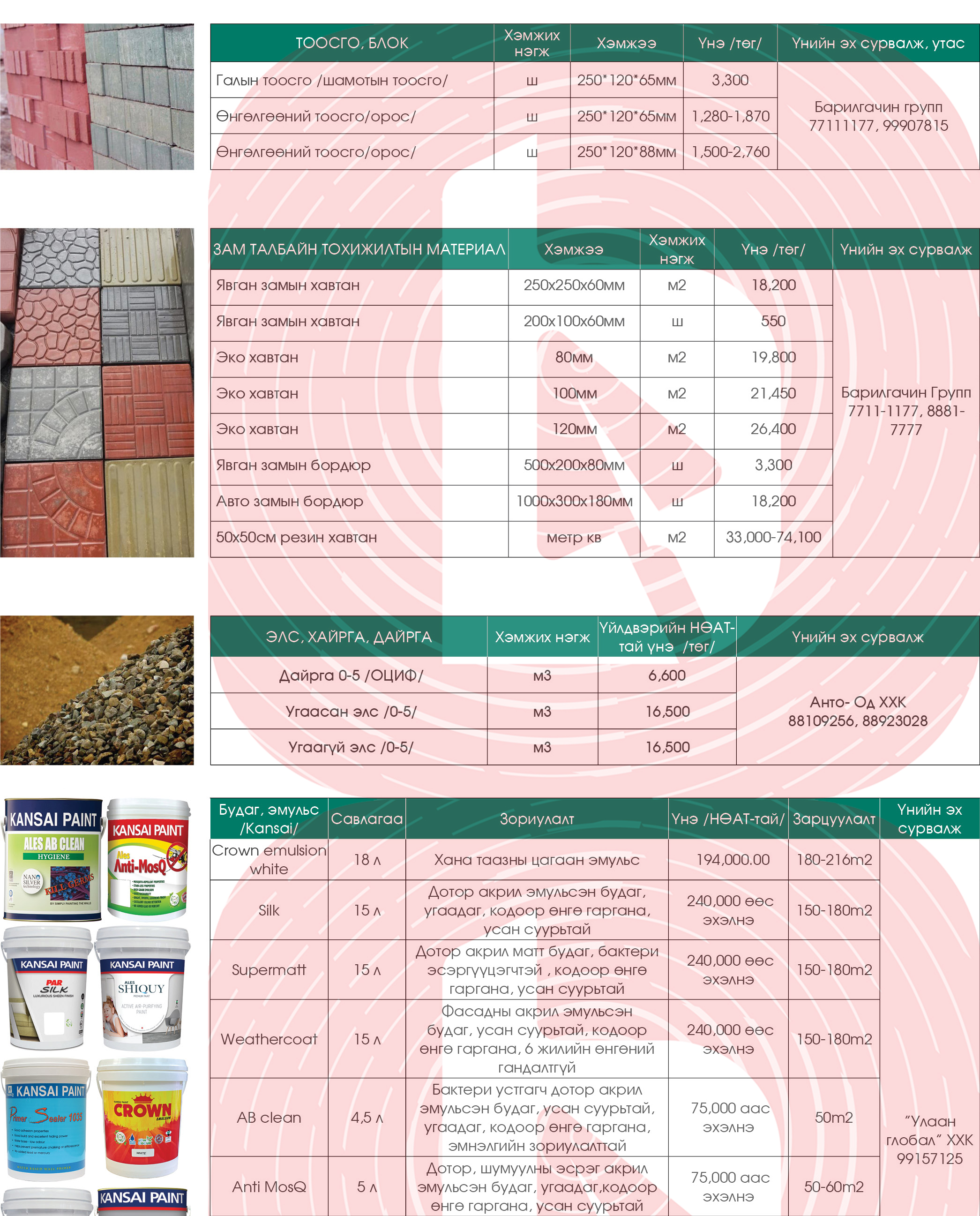 "Барилга.МН" сэтгүүлээс сар бүр хүргэдэг барилгын материалын үнэ ханшийн мэдээллийг уншигч танд хүргэж байна. Илүү дэлгэрэнгүй мэдээлэл авахыг хүсвэл манай сэтгүүлийн 2022 оны 2-р сарын дугаар №141-ээс үзэх боломжтой.