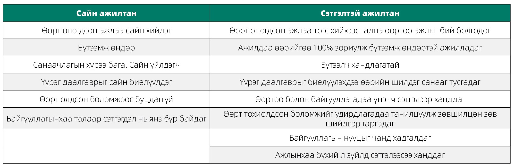 Хүснэгт 1. Сайн ажилтан, сэтгэлтэй ажилтны харьцааИйм сэтгэлтэй хүмүүсийн ажлаас гарах магадлал 25% бага, ажилдаа алдаа гаргах магадлал 60% бага, бусадтай харьцуулахад бүтээмж 18%- аар өндөр байдаг гэсэн судалгаа байдаг байна. Сэтгэлтэй ажилтны нэг гол үнэ цэнэ нь тэдний ёс зүйтэй байдал юм. Тэдэнд үнэнч шударга, ёс зүйтэй зан чанар үйлдэл бүрт нь илэрч байдаг. Ийм хүмүүсээр байгууллага багаа бүрдүүлэхийг зорих хэрэгтэй.