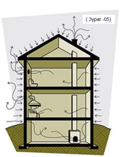 Мэдээж энэ агаарыг нөхөх шаардлагатай тул гаднах агаарыг мөн л барилгын согог, агааржуулалтын хоолой, хаалга, цонхоор барилгын дотогш дамжуулан авдаг. Үүний нөлөөгөөр хүйтэн агаар түлхүү орж ирэн сууцны дотор зөвхөн зуухны тэнд дулаан мэдрэгдэж түүнээс холдох тусам ялангуяа зуух байрлаагүй өрөөнүүд хүйтэн болдог байна. Яг дээрх зарчимтай адил схемээр агааржуулалтын нээлттэй ердийн систем бас барилгын дулааныг гадагш алдах гол хүчин зүйл болдог байна. (Зураг-5)