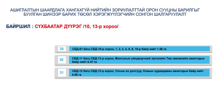 29 | СБД-01 | Сүхбаатар дүүргийн 10 дугаар хорооны 1, 2, 3, 4, 6, 9, 10 дугаар байр, нийт 1.56 га |