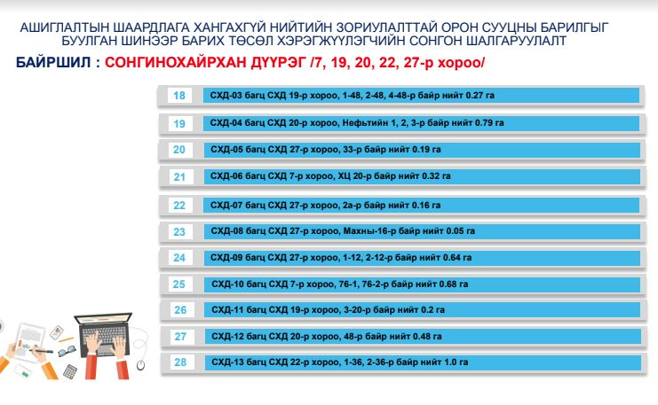 18 | СХД-03 | Сонгинохайрхан дүүргийн 19 дүгээр хорооны 1-48, 2-48, 4-48 дугаар байр, нийт 0.27 га |