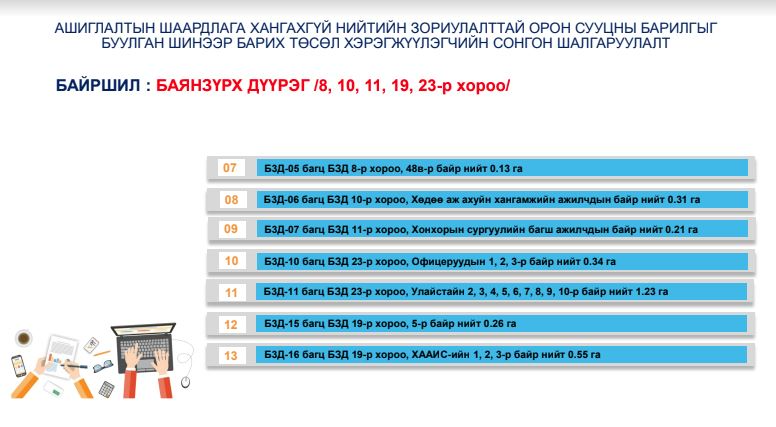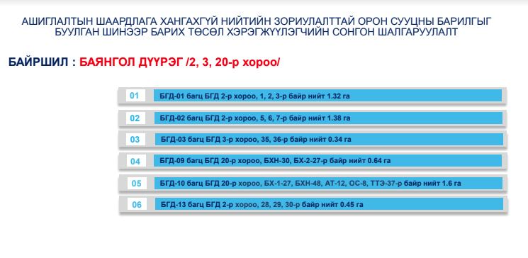 5 | БГД-10 | Баянгол дүүргийн 20 дугаар хорооны БХ-1-27, БХН-48, АТ-12, ОС-8, ТТЭ-37 дугаар байр, нийт 1.6 га |