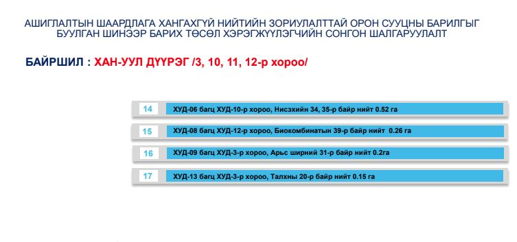 17 | ХУД-13 | Хан-Уул дүүргийн 3 дугаар хорооны Талхны 20 дугаар байр, нийт 0.15 га |