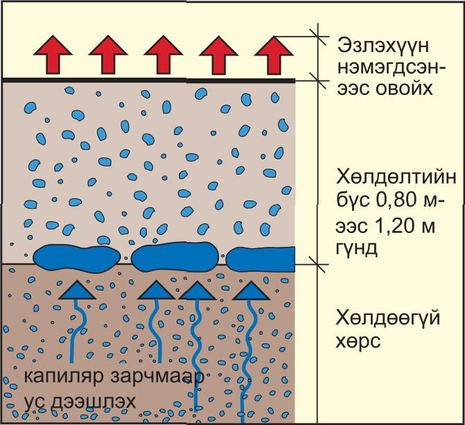 Барилгын буурьт ирэх ачаалал хөрсний бүтэц, хөрсний ус, дулаалга зэргээс хамааран барилгын суурийг хөлдөлтийн гүнээс доош, дээш суулгахыг тооцоогоор шийддэг.