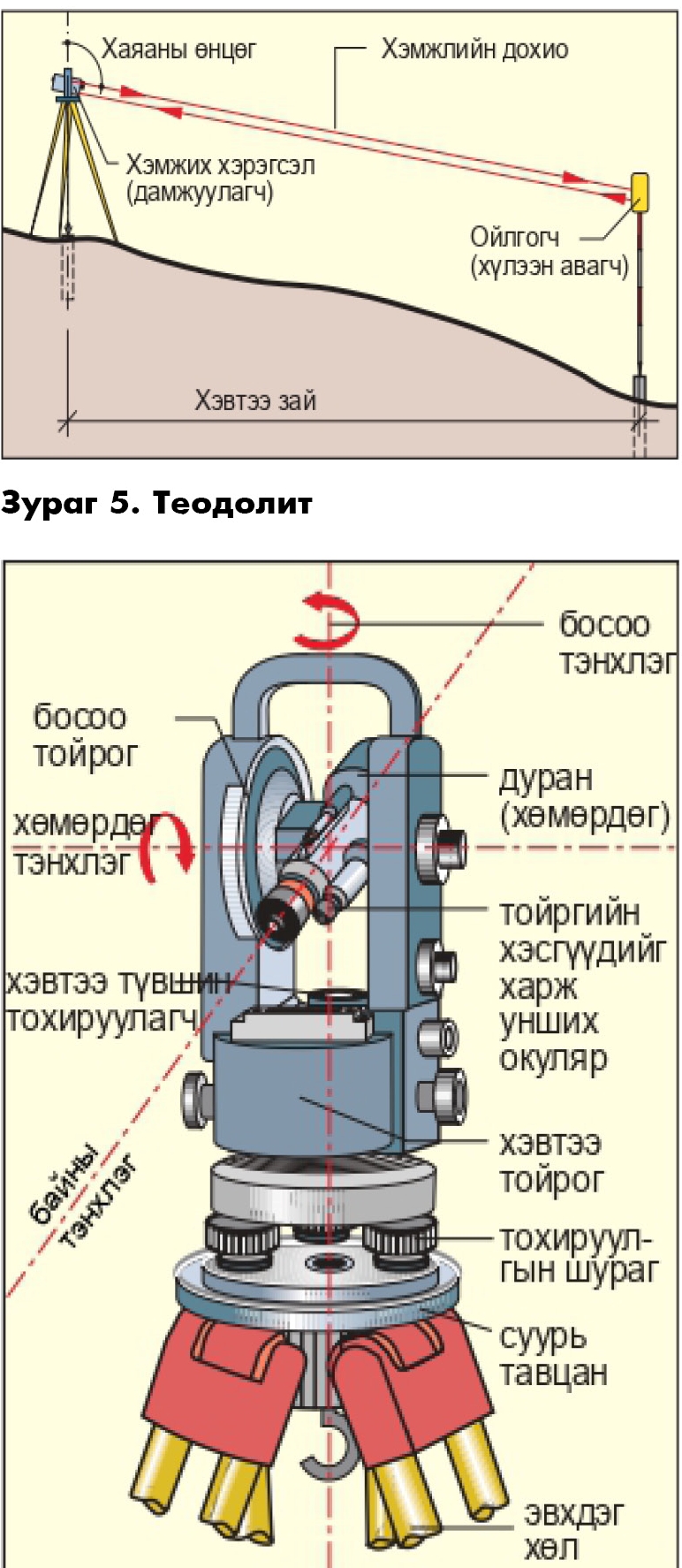 Геодезийн ажил нь барилга угсралтын ажлын бүх явцад байнга хийгдэж байдаг нарийн хэмжилтийн ажил бөгөөд өндөр нарийвчлал бүхий оптик, лазерын төхөөрөмжүүд (теодолит, нивелир, лазерын тэгшлэгч) ган туузан метр, рейк болон хэмжээ тавих, хадгалах бусад төхөөрөмжүүд, багаж хэрэгсэлтэй байдаг.