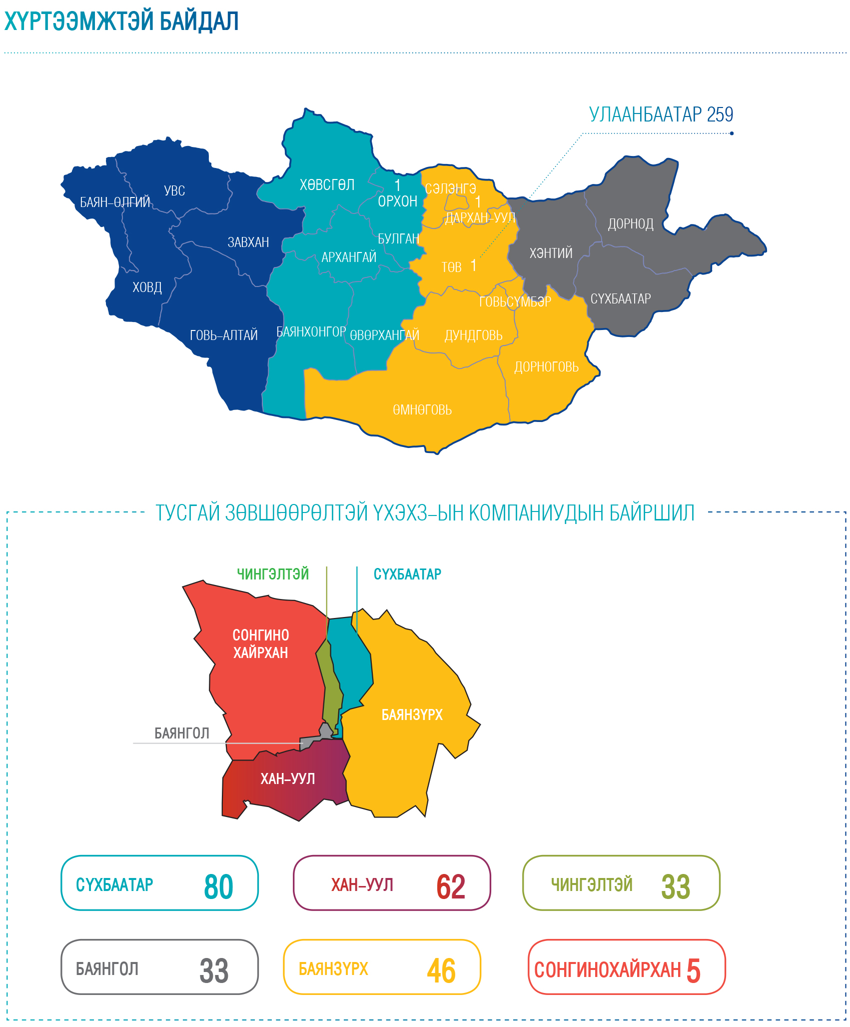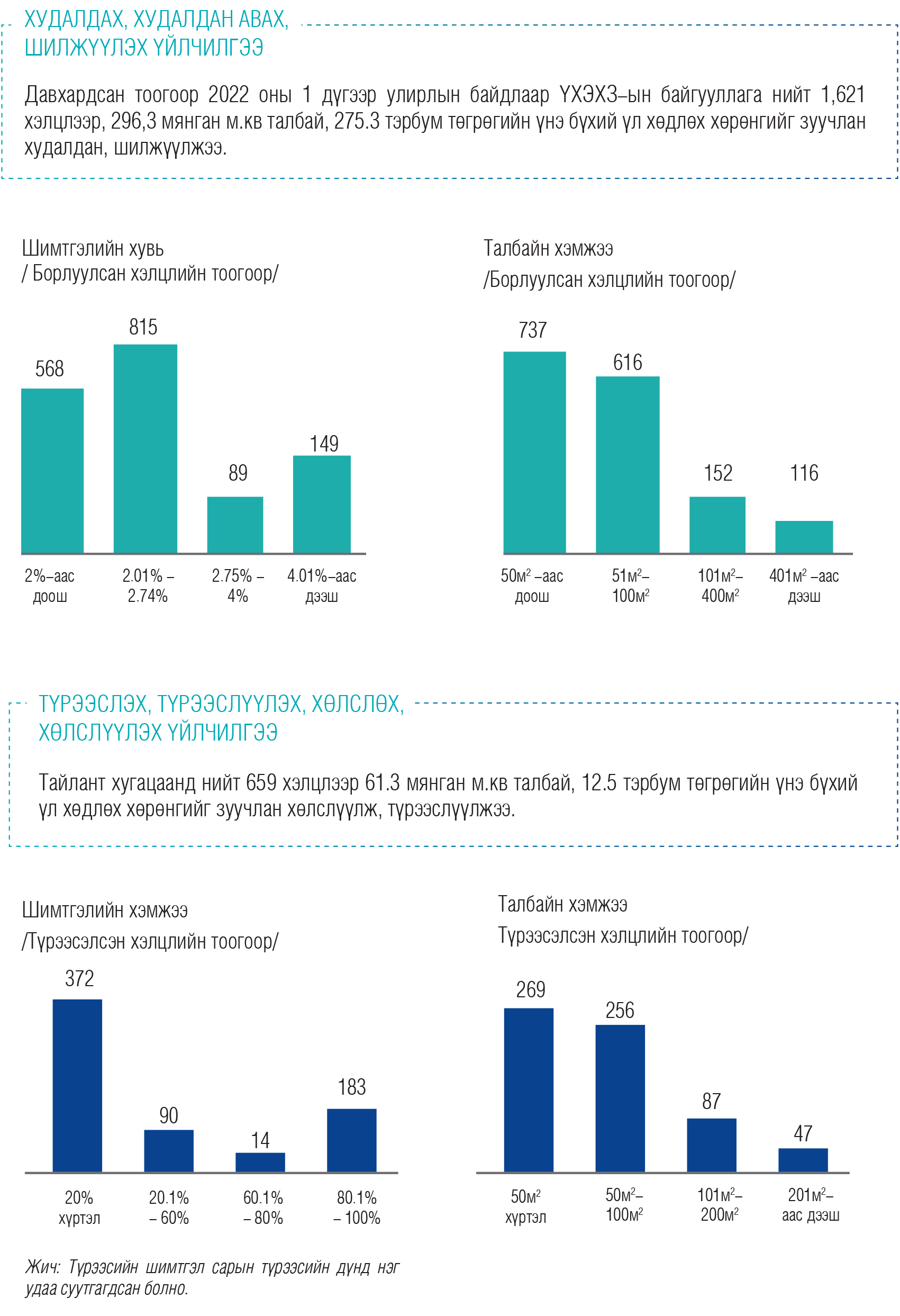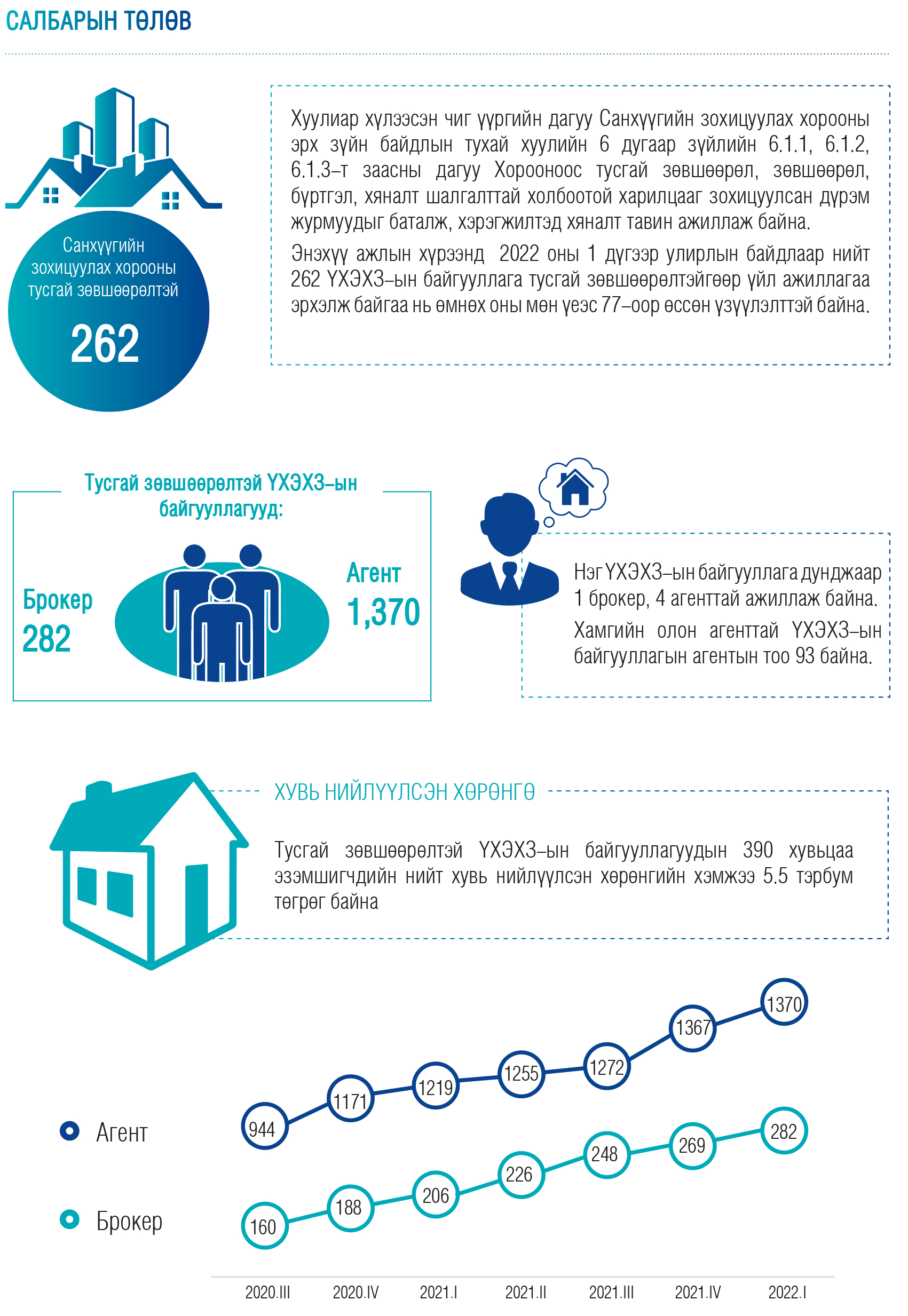 Энэ оны нэгдүгээр улирлын байдлаар Санхүүгийн зохицуулах хорооноос тусгай зөвшөөрөл авсан үл хөдлөх эд хөрөнгө зуучлалын чиглэлийн 262 компани, тэдгээрийн 282 брокер, 1,370 агент ажиллаж байна. Давхардсан тоогоор эдгээр байгууллага нийт 1,621 хэлцлээр 296.3 мянган м.кв талбай, 275.3 тэрбум төгрөгийн үнэ бүхий үл хөдлөх хөрөнгийг зуучлан худалдаж, шилжүүлжээ. Харин нийт 659 хэлцлээр 61.3 мянган м.кв талбай, 12.5 тэрбум төгрөгийн үнэ бүхий үл хөдлөх хөрөнгийг зуучлан хөлслүүлж, түрээслүүлсэн байна.