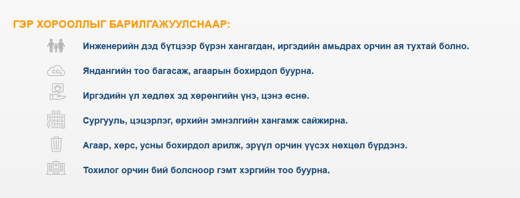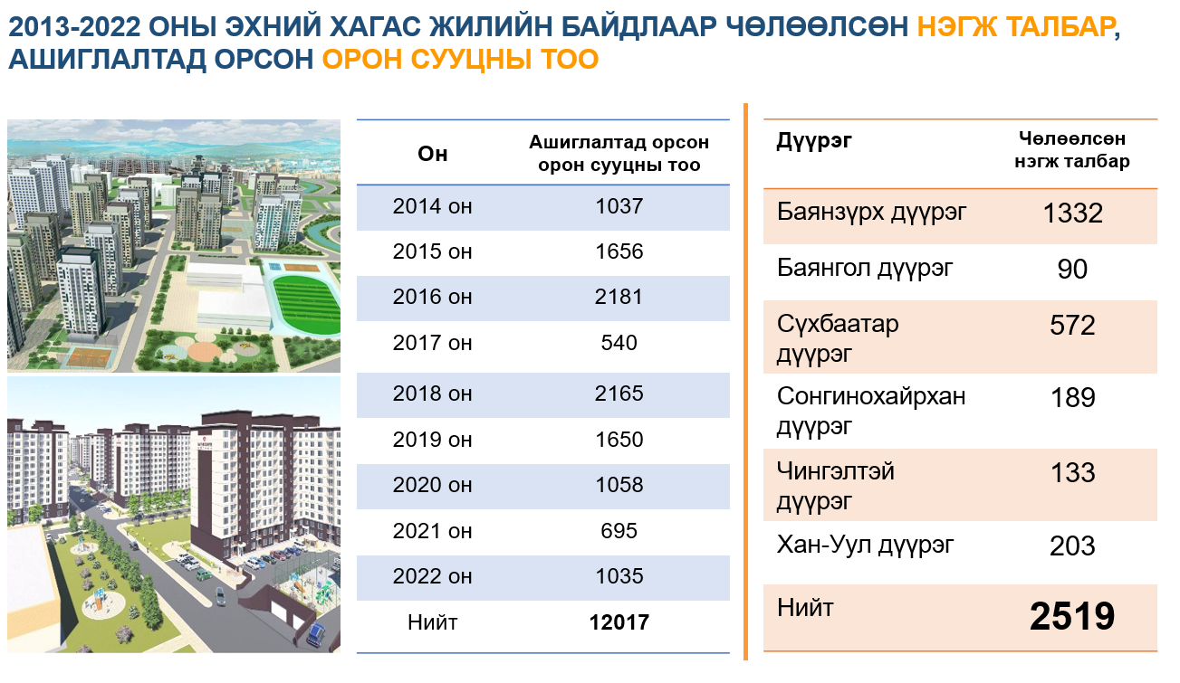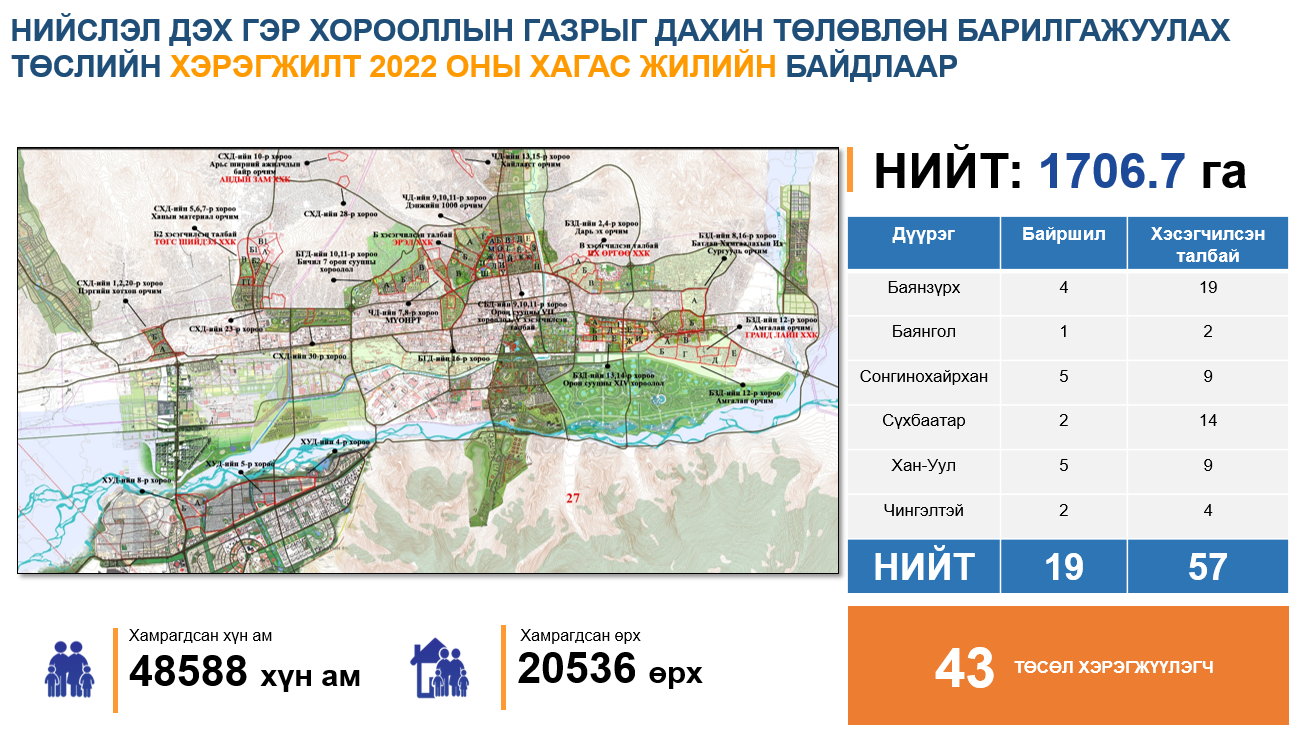 Гэр хорооллын газрыг дахин төлөвлөн барилгажуулах ажил нийслэл Улаанбаатар хотод 2013 оноос эхэлсэн. 2021 оны байдлаар гэр хорооллын 1,706.7 га талбай, 19 байршил, 57 хэсэгчилсэн талбайд 43 төсөл хэрэгжүүлэгч төсөл хэрэгжүүлээд байна. Төслийн хүрээнд 2519 айл газраа чөлөөлж, 12 мянган айлын орон сууцыг ашиглалтад оруулж, гэр хорооллын 5000 гаруй /5182/ янданг буулгасан. Түүнчлэн төслийн хүрээнд нийгмийн дэд бүтэц буюу сургууль, цэцэрлэг, эмнэлгийн барилга зэргийг стандартын дагуу барьж байгуулан ашиглалтад оруулсаар байгаа юм. Өнгөрсөн хугацаанд жилд дунджаар 1500 айлыг орон сууцанд оруулдаг байсан бол 2021 оноос эхлэн дэд бүтцийн хүрээнд олон арга хэмжээ хэрэгжүүлж энэ жилээс эхлэн 5-6 мянган айлыг орон сууцтай болгохоор төлөвлөөд ажиллаж байгаа. Нийслэл Улаанбаатар хотын хэмжээнд жилд дунджаар 13-14 мянган айлын орон сууц ашиглалтад ордог. Энэ оны эхний хагас жилийн байдлаар 7300 айл шинээр орон сууцанд ороод байна. Оны эцэс гэхэд 15 мянган орон сууц ашиглалтад орохоор байгаа.