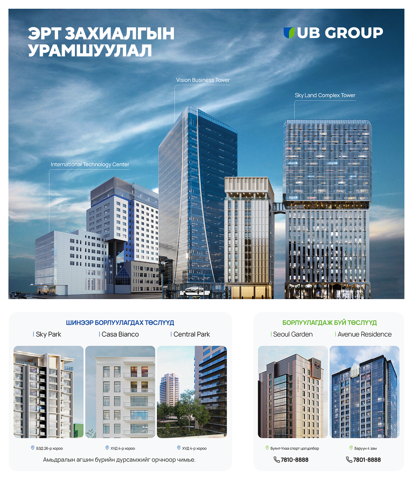 “БАРИЛГА-ОРОН СУУЦ 2022” үзэсгэлэн, яармагийн Ерөнхий ивээн тэтгэгч UB GROUP -н хэрэгжүүлж буй бүтээн байгуулалтыг танилцуулж байна. Тус үзэсгэлэн, яармаг нь “Тогтвортой хөгжилд хамтдаа” уриан дор 9 дүгээр сарын 9-11 өдрүүдэд “Мишээл экспо төв”-д зохион байгуулагдана.