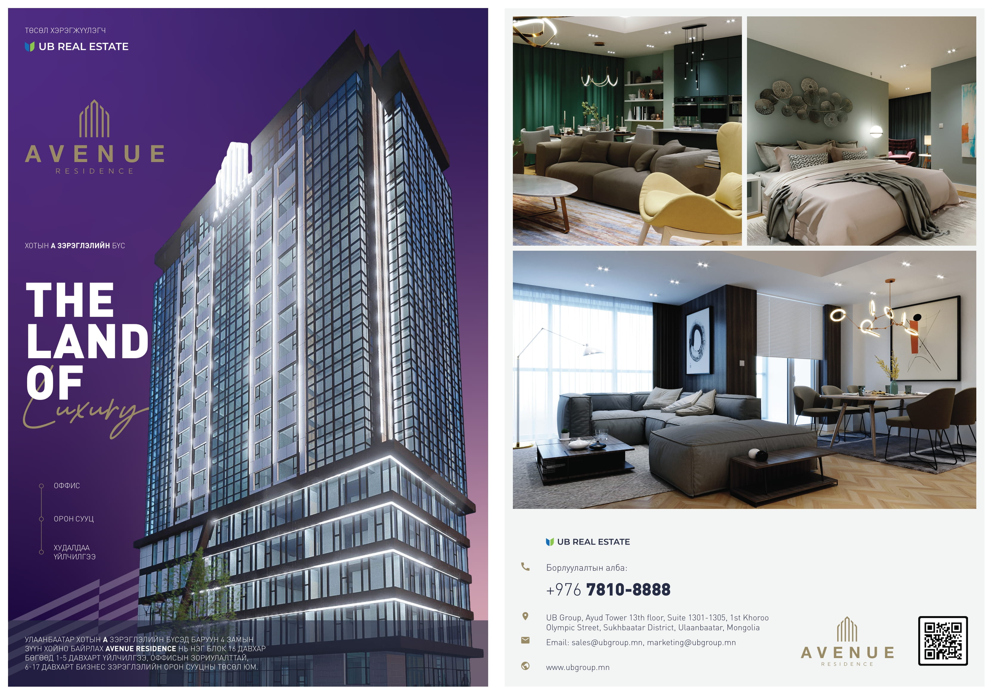 Улаанбаатар хотын А зэрэглэлийн бүсэд баруун 4 замын зүүн хойно байрлах AVENUE RESIDENCE нь нэг блок 16 давхар бөгөөд 1-5 давхарт үйлчилгээ, оффисын зориулалттай, 6-17 давхарт бизнес зэрэглэлийн орон сууцны төсөл юм.
