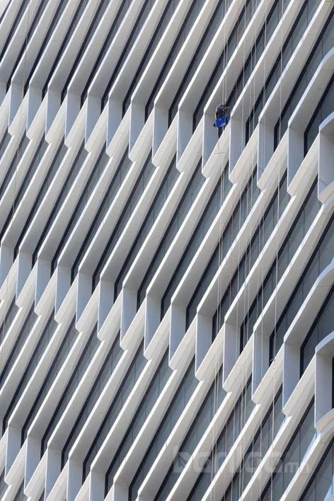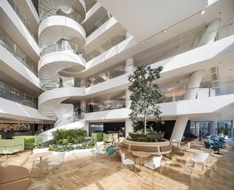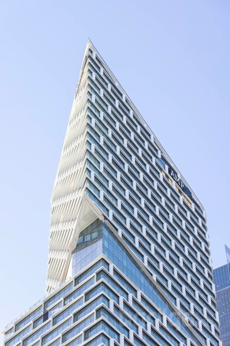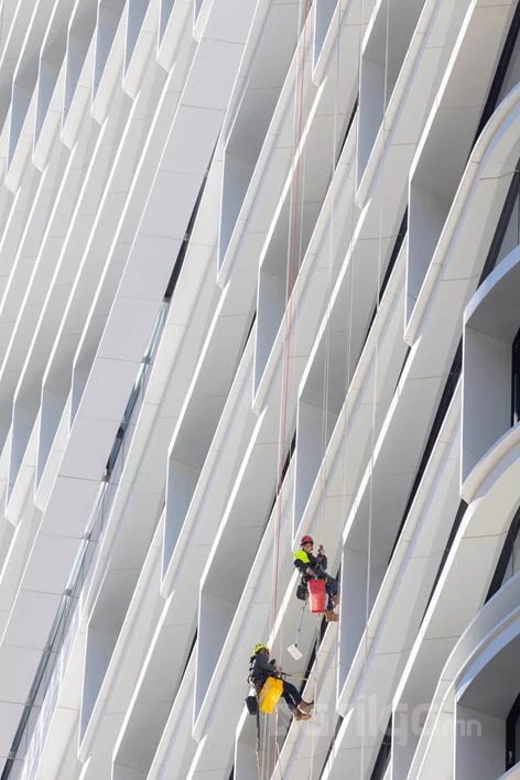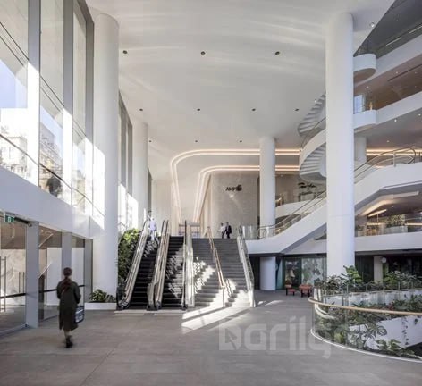 Барилгын гадна фасад нь нэг нэгнийхээ дээр давхарласан шилэн бүтэцтэй, таван цуврал шилжилтээс бүрдэнэ. Энэ нь том босоо шалны хавтанг ашигладаг кампус маягийн бүтээн байгуулалтууд дээр суурилдаг ба таван босоо хэмжээ нь нийлээд 2000м² цэвэр шалны хавтанг бүрдүүлдэг байна.