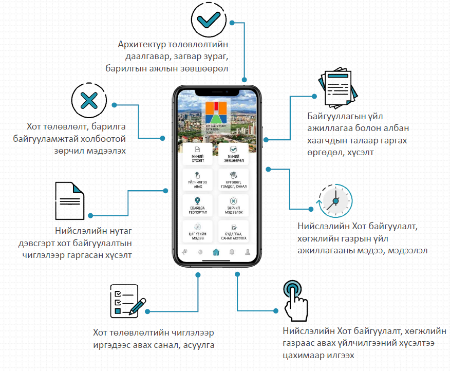 Гар утасны аппликейшн ашиглан иргэн, АНН өөрийн өргөдөл, хүсэлтийн шийдвэрлэлтийн явц аль шатанд явж байгаа харах, барилга байгууламжийн зөвшөөрлийн хугацааны мэдээлэл, мэдэгдлийг харах, зөвшөөрөлгүй баригдаж буй барилга байгууламжтай холбоотой зөрчлийг мэдээлэх, иргэд олон нийт рүү чиглэн боловсруулагдаж байгаа Хот байгуулалт, төлөвлөлтийн төсөл, хөтөлбөрийн мэдээллийг шуурхай авах, өөрийн санал, хүсэлтээ илгээх боломжтой юм.