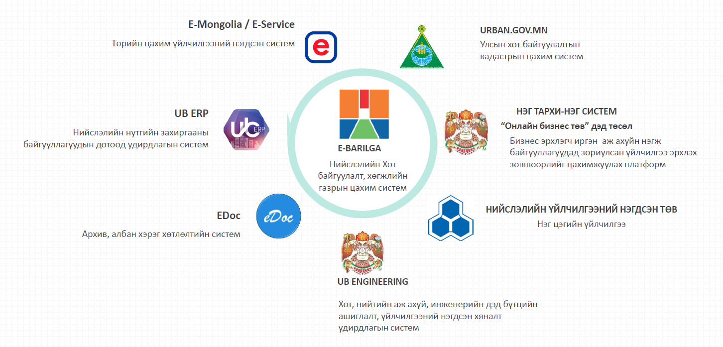 “eBARILGA” систем нь нийслэлийн хөгжлийн ерөнхий төлөвлөгөө, хэсэгчилсэн ерөнхий төлөвлөгөөний мэдээлэл болон барилгын зөвшөөрөлтэй холбоотой мэдээллийг нээлттэй харуулах ГЕОПОРТАЛ /www.ebarilga.ub.gov.mn/, Хот байгуулалт, хөгжлийн газарт иргэн, хуулийн этгээдээс хандан цаасан болон цахим хэлбэрээр гаргасан хүсэлт, түүний шийдвэрлэлтийн явцыг хянах, хот төлөвлөлт, барилгажилттай холбоотой зөрчил, гомдол мэдээллэх боломжийг бүрдүүлсэн ГАР УТАСНЫ АППЛИКЕЙШН /eBARILGA/-ээс бүрдэх вэб, аппликейшн хосолсон цахим систем юм.