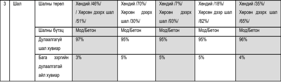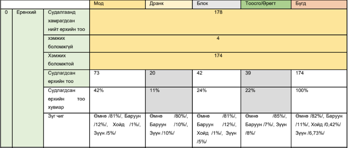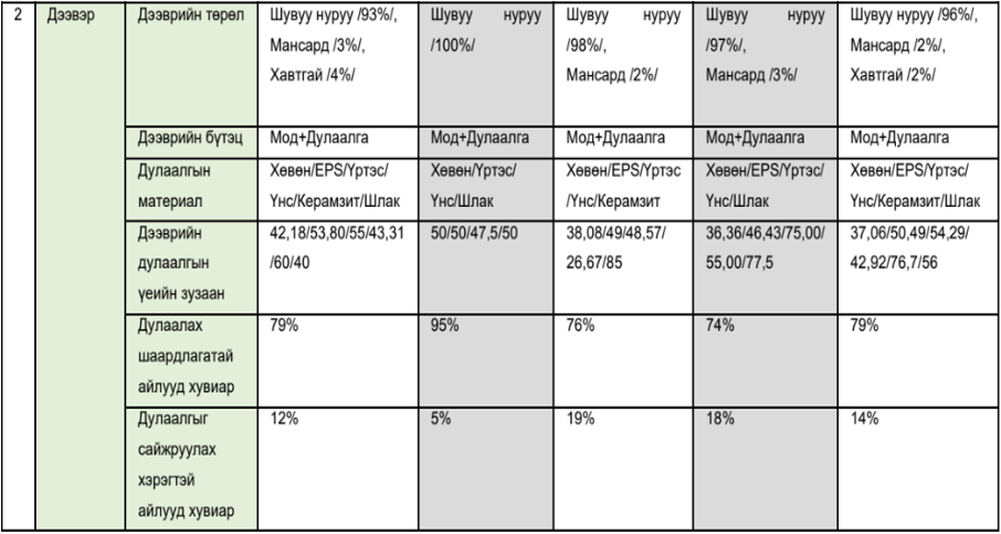 Судалгаагаар 178 айлын сууцыг хэмжих төлөвлөгөөтэй байсан ч 4 сууц цаашид хүн амьдрах боломжгүй, хэмжилт хийх болон засаж сайжруулах боломжгүй гэсэн шалтгааны улмаас хасагдаж 174 айлын сууцны нөхцөл байдалд техникийн үнэлгээ хийв. Нийт сууцыг үндсэн бүтээцийн төрлөөс нь хамааруулж модон, шавардлагатай дранкан, блокон болон тоосгон гэсэн үндсэн 4 төрөлд хуваасан.