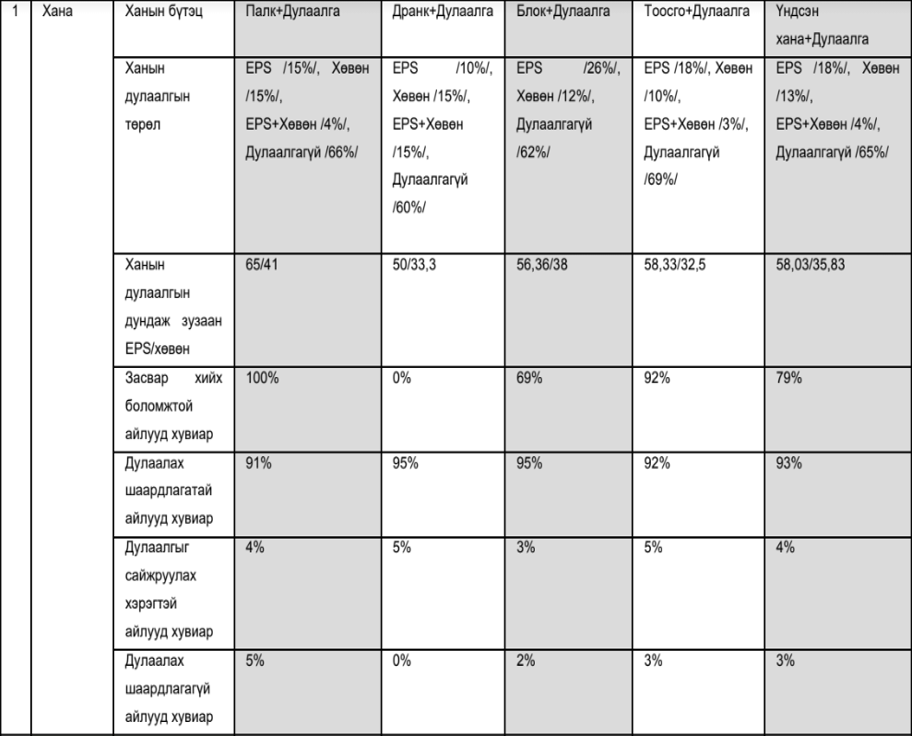 Судалгаанаас үзэхэд нийт 178 байшингийн 4 нь ашиглах боломжгүй үлдсэн нь бүгд шахуу буюу 95 хувь нь ямар нэгэн дулаалга, хаалга цонхны сайжруулалт, халаалтын зөв шийдэл, дотор агаарын чанарыг сайжруулах шаардлагатай нь харагдаж байна.