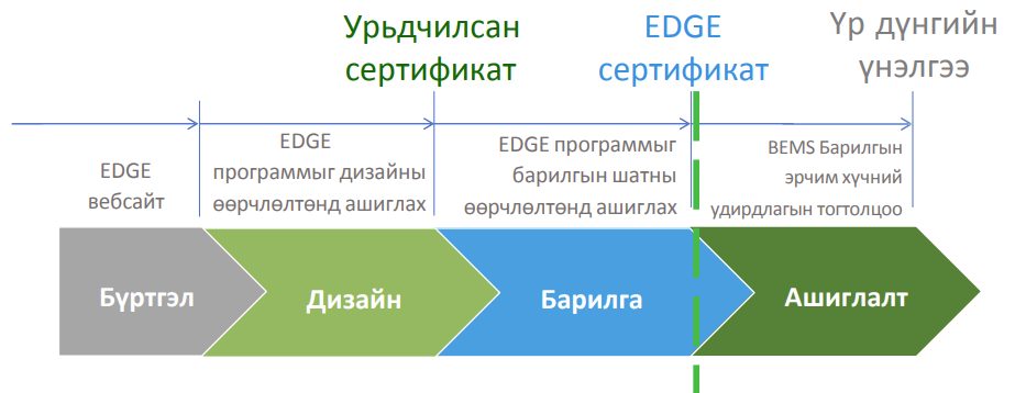Харин олон улсад ногоон барилгыг үнэлэх 100 гаруй аргачлалууд байдгаас манайд EDGE үнэлгээг түлхүү хэрэглэж түүн дээр суурилсан бодлогын шинж чанартай үйл ажиллагаа явуулж байна. EDGE аргачлалыг сонгон авсан шалтгаан нь Олон Улсын Санхүүгийн Корпорац нь Барилга хот байгуулалтын яам, Байгаль орчин, аялал жуулчлалын яам, Эрчим хүчний зохицуулах хороотой Харилцан ойлголцлын санамж бичиг байгуулж, ногоон барилгын үнэлгээний системийг нэвтрүүлэх чиглэлээр хамтарсан төсөл хэрэгжүүлэх болсонтой холбоотой юм. EDGE гэдэг нь “Дизайны үр ашгийг төгөлдөржүүлэх” буюу Excellence in Design for Greater Efficiency (EDGE) гэсэн үгнүүдийн товчлол юм.