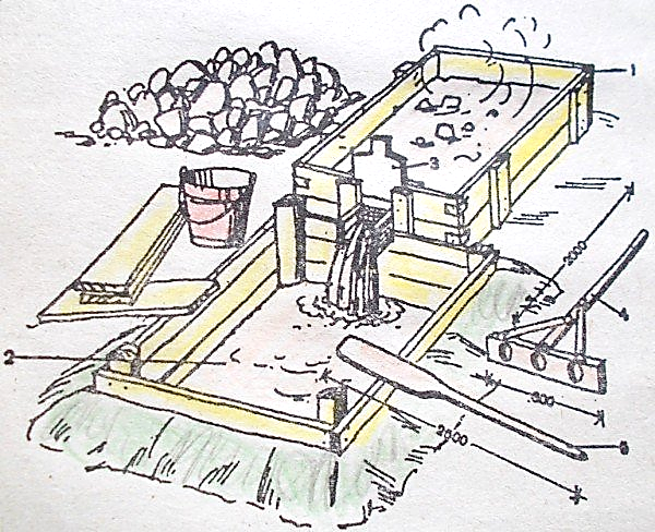 1-шохойг устай холих хайрцаг, 2-газар суурилуулсан шохойг бүрэн унтраах нүх, 3- ,шохой усны хольцыг нүхэнд юүлэх хаалт,хаалтын ард шүүр байна. Шүүрийн торны нүх дутуу шатсан шохойн голыг шүүж холих хайрцагт үлдээнэ. 4-малтуур, 5-хутгуур.