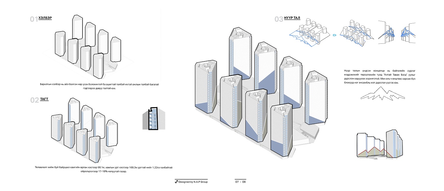 “ТАВАН БОГД ПРОПЕРТИ” ХХК-ийн захиалгаар “MGL E&C” ХХК-ийн гаргасан барилгын хэлбэр, концепц дээр тулгуурлан 2020 оноос эхлэн эх загвар зураг, ажлын зураг төслийг боловсруулан, зохиогчийн хяналт тавин одоог хүртэл хамтран ажиллаж байна.