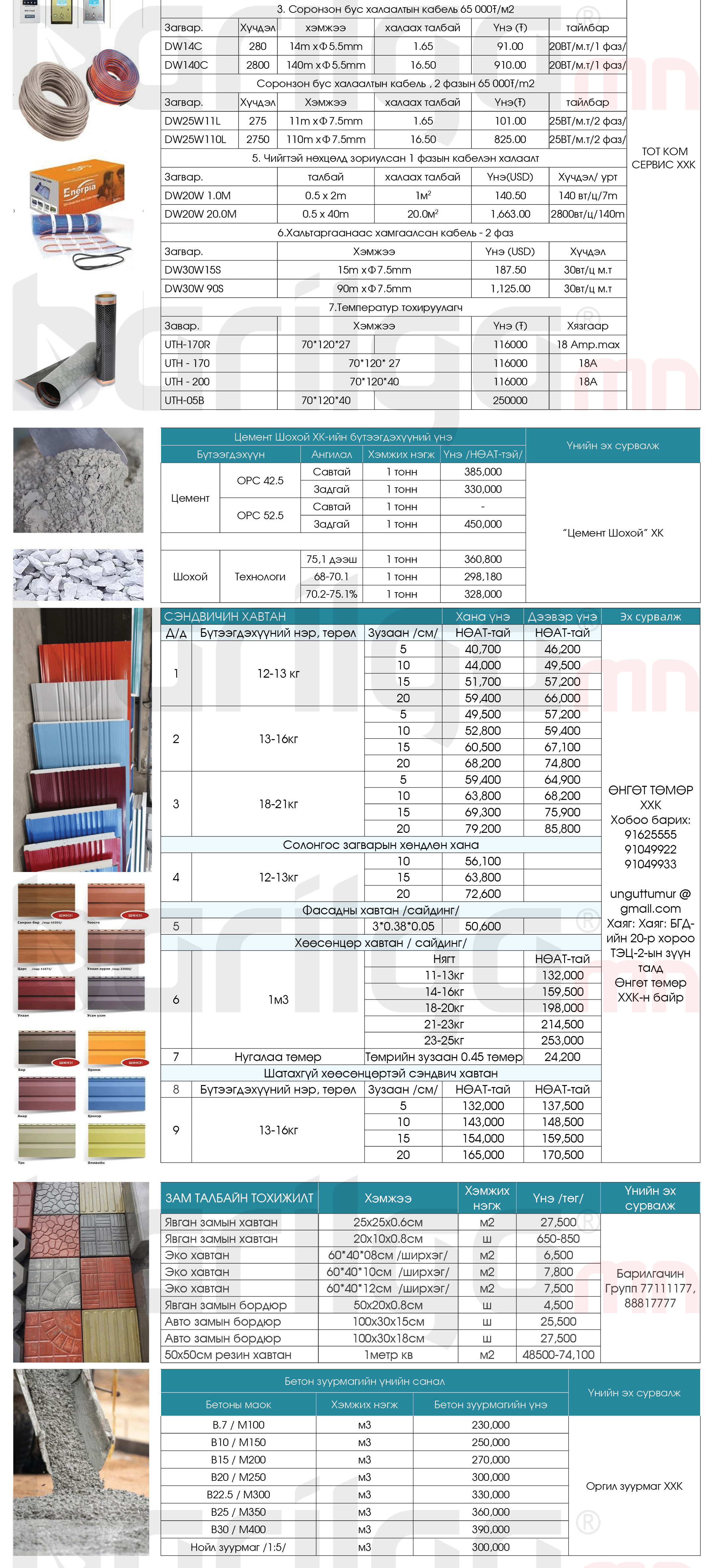 Зарим нэр төрлийн барилгын материалын үнэ ханшийн мэдээлэл