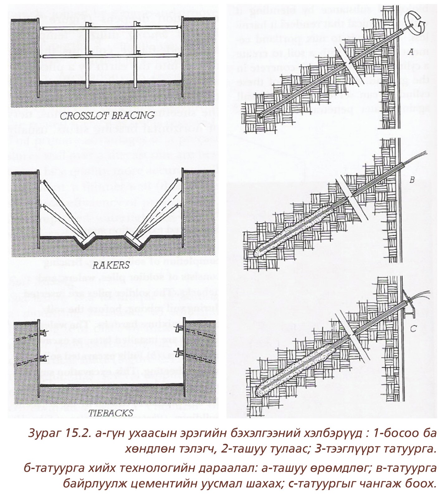 Ухмалын гүн 4 м-ээс бага байхад бэхэлгээний тулгуурын шонгуудыг нэмэлт бэхэлгээгүйгээр суулгах бөгөөд харин гүн ухаасын ханын бэхэлгээнд 4-6 м тутамд тэлэгч холбоос хийж бэхэлдэг (Зураг 15.1в). Гүний хэмжээнд 4м тутамд бэхэлгээ хийж явах шаардлагатай. Барилгын ажил ухмал дотор явуулахад тэлэгч саад болохоор бол шонгуудыг тээглүүрт татуургаар(анкераар) бэхлэх нь оновчтой байдаг(Зураг 15.1б).