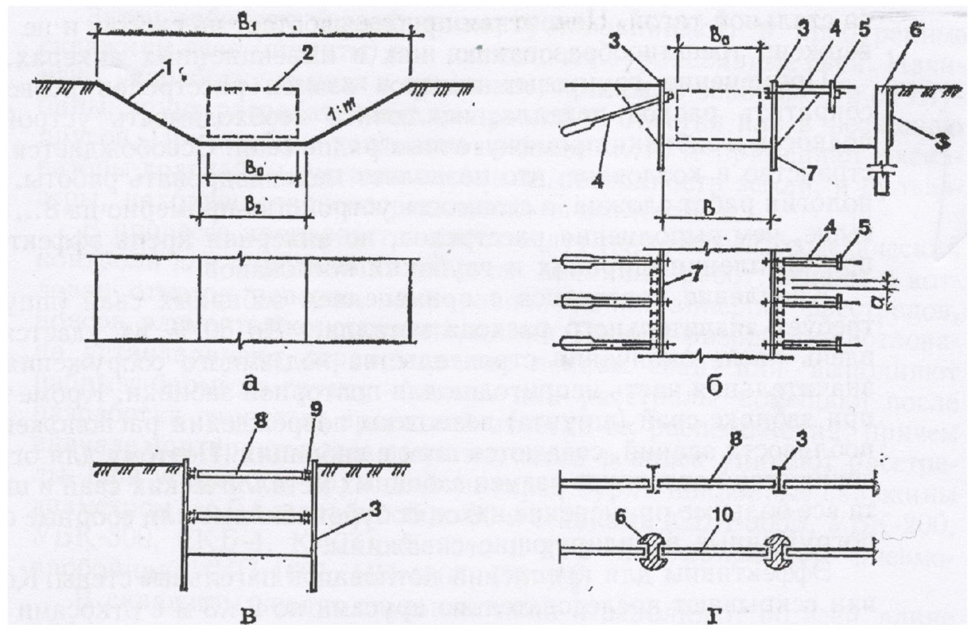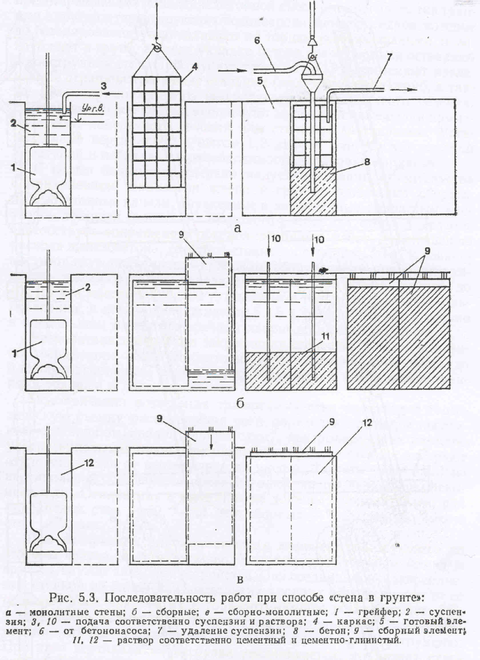 1- хөрс авах грейфер; 2-шаврын уусмал-суспензи; 3, 10-шаврын уусмал дамжуулах хоолой; 4-арматурын каркас; 5-бэлэн болсон ханын хэсэг; 6-бетон насосын дамжуулах хоолой; 7-илүүдэл уусмалыг юүлэх хоолой; 8-бетон; 9-угсармал элемент; 11-цементийн уусмал; 12- шавар-цементийн уусмал.