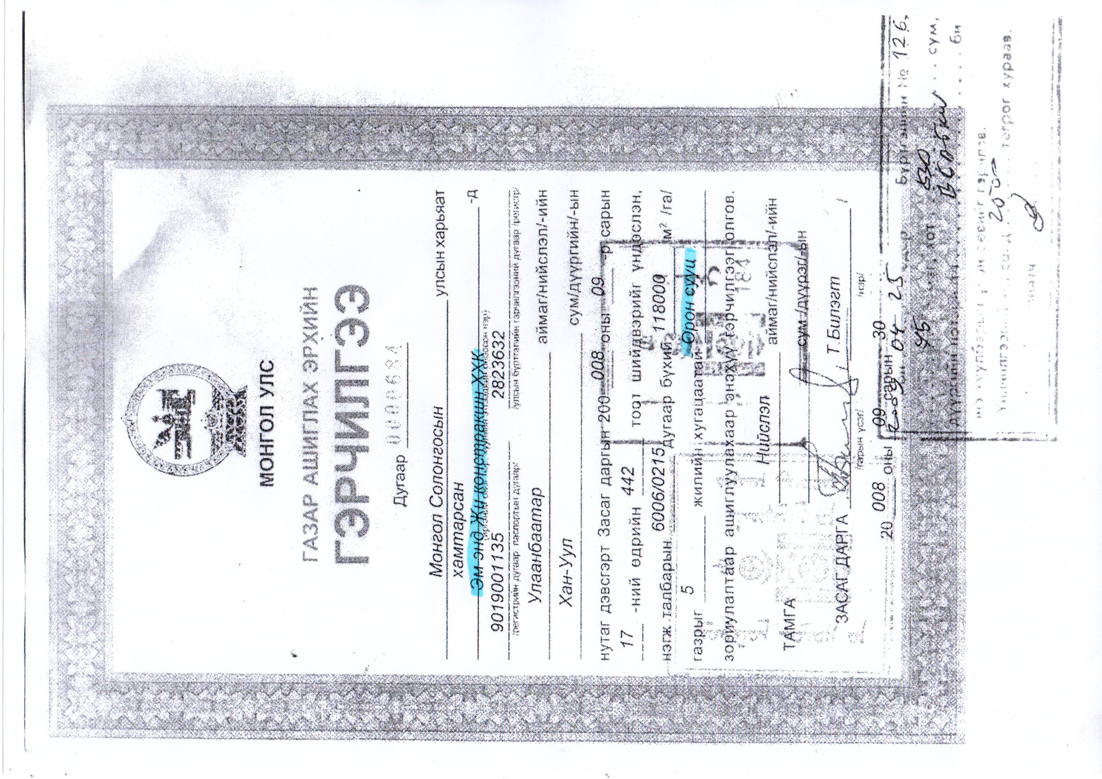 2007 оны 7-р сарын 4-ны өдөр 138 дугаар “Нийслэлийн иргэдийн төлөөлөгчдийн хурлын тэргүүлэгчдийн тогтоол”-оор Монгол улсын засгийн газраас 40,000 айлын орон сууцны хөтөлбөрийг хэрэгжүүлэх ажлын хүрээнд Хан-Уул дүүргийн 1-р хороо одоогийн 15-р хорооны нутаг дэвсгэрт 11,8 га газарт “Эм энд Жи констракшн ХХК”-д орон сууцны зориулалтаар олгохыг дэмжсүгэй гээд зөвшөөрөл олгосон. Энэ тогтоолын хүрээнд Хан-Уул дүүргийн засаг даргаас 2008 онд захирамж гарч, газар ашиглах гэрчилгээ гарсан. Цаашлаад дуудлага худалдааны анхны үнэ тухайн 207,680,000 төгрөгийг тушаасан. Өнөөдрийг хүртэл 1 тэрбум 100 сая орчим төгрөгний газар өмчлөх төлбөр төлсөн байна.
