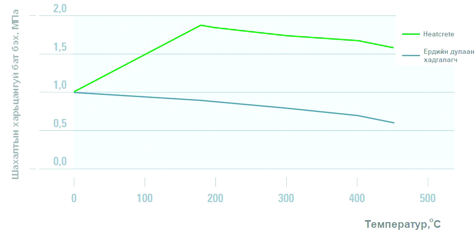 “HEATCRETE” бетоны шахалтын бат бэх нь дулааны үйлчлэлийн үед нэмэгдэж, өндөр температурт тогтвортой байгаа нь дээрх зургаас харагдаж байна. Өөрөөр хэлбэл “HEATCRETE” бетоны бат бэх нь ажлын өндөр температурт ч хадгалагдана гэсэн үг юм.