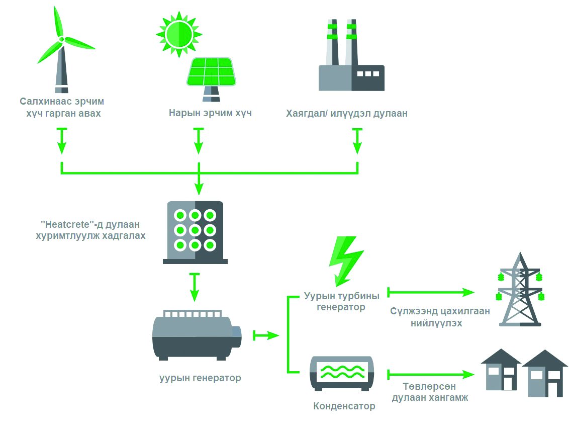 Хайделбергийн материалын компанитай хамтран бүтээсэн дулаан хадгалах нь системийн (Thermal Energy Storage) салшгүй хэсэг нь тусгай хольцоос бүрдэх “HEATCRETE” бетон ажээ.