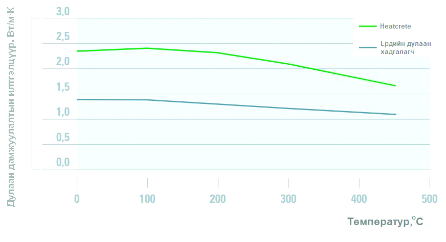 1. Дулаан дамжуулалтын илтгэлцүүр ер бусын өндөр буюу 1.8 Вт/м∙К-с их байх, (ердийн хуурай бетоны дулаан дамжуулалт нь тасалгааны температурт 1.0 Вт/м∙К байдаг)