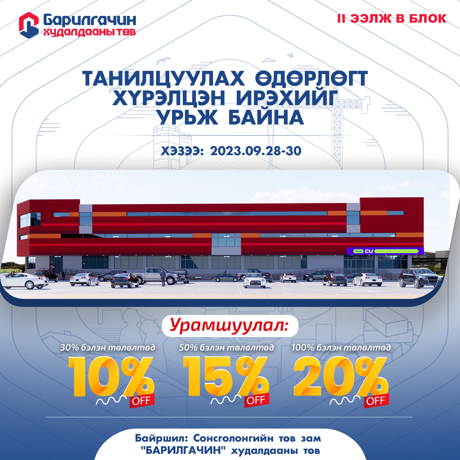 Баруун бүсийг чиглэсэн бүтээн байгуулалтыг барилгын материалаар хангаж, бизнес эрхлэгчдийн үйл ажиллагааг дэмжих зорилготой “БАРИЛГАЧИН” худалдааны төвийн А блок ашиглалтад орж үйл ажиллагаагаа эхлүүлсэн бөгөөд өдөр бүр 09:00-18:00 цагийн хооронд ажиллаж байна. Энэхүү худалдааны төвийн В блокийн барилгын ажил явагдаж байгаа бөгөөд урьдчилсан захиалга албан ёсоор эхлүүлээд байгаа билээ. В блокийн барилга нь төмөр бетон бүтээцэн хийцлэлтэй бөгөөд барилгын бүхий л төрлийн материалуудыг нэг дор төвлөрүүлэх зорилгоор талбайгаа шууд худалдаалж байна. Та бүхэн бизнесээ өргөжүүлж, өөрийн гэсэн Үл Хөдлөх Хөрөнгөтэй болхыг сонирхож байгаа бол В блокийн худалдааны талбайн талаарх дэлгэрэнгүй мэдээлэл хүргэх “ТАНИЛЦУУЛАХ ӨДӨРЛӨГ”-ийг 2023 оны 09 сарын 28-30ны өдрүүдэд 09:00-18:00 цаг хүртэл болно. Барилгын материалын худалдаа эрхлэгчид, ханган нийлүүлэгчид та бүхэн өдөрлөгт хүрэлцэн ирж урьдчилсан захиалгаа өгснөөр талбайг 20 хүртэлх хувийн хямдралтай худалдан авах хямдрал урамшууллыг зарлаад байна. Мөн та бараа бүтээгдэхүүн нийлүүлэх болон ажил гүйцэтгэл хийж бартерын нөхцөлөөр талбай худалдан авах таатай нөхцөлийг санал болгож байна.