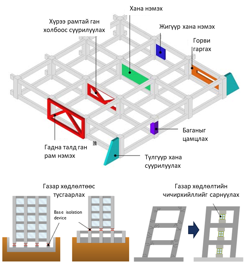 Барилгын газар хөдлөлт тэсвэрлэлтийг нэмэгдүүлэхэд дараах аргуудыг ашигладаг.