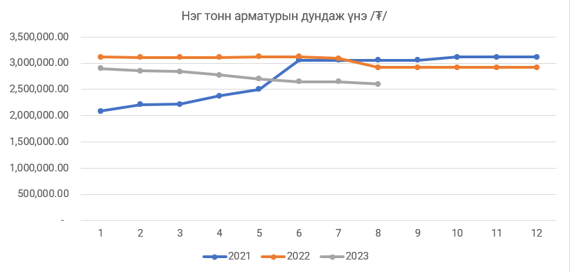 Харин олон улсын зах зээл дээр нэг тонн арматурын үнэ өнгөрсөн оноос дунджаар 15 хувиар буурсан бөгөөд өмнөх оны мөн үед нэг тонн арматур 643.64 ам.доллар байсан бол энэ оны наймдугаар сарын байдлаар 560.5 ам.доллар буюу 13 хувиар буурсан үзүүлэлттэй байна.