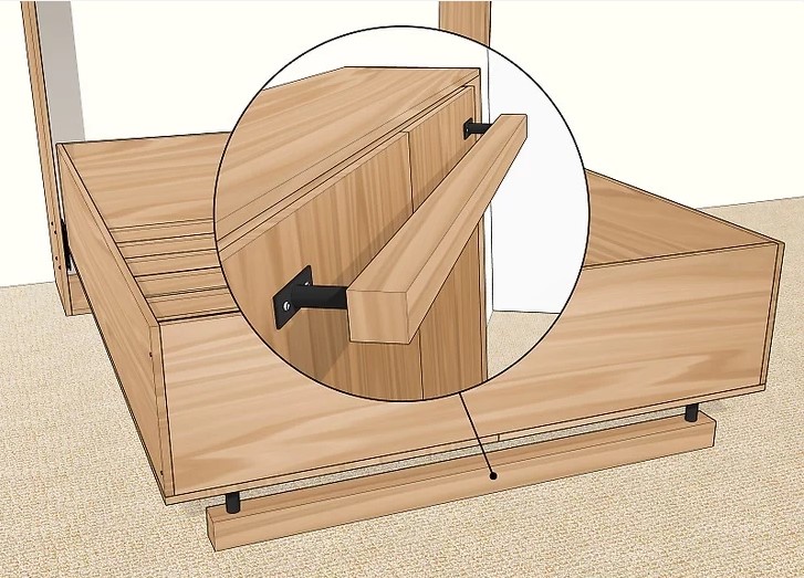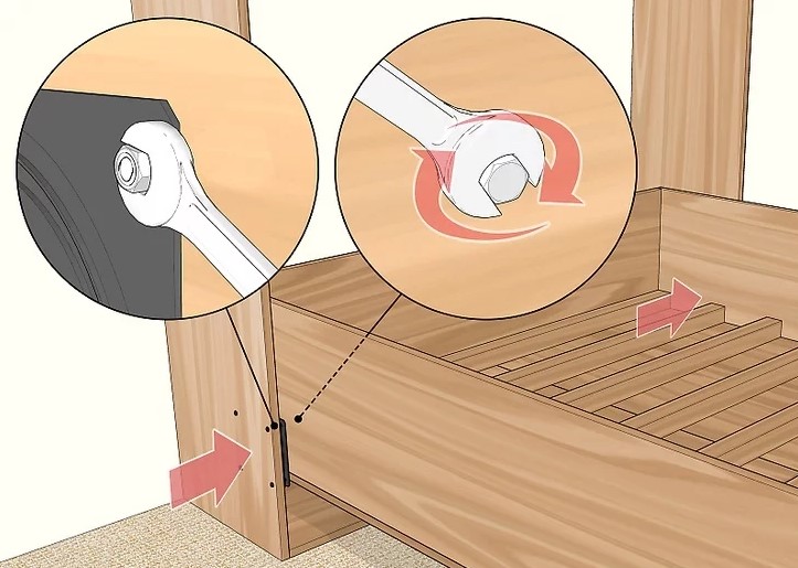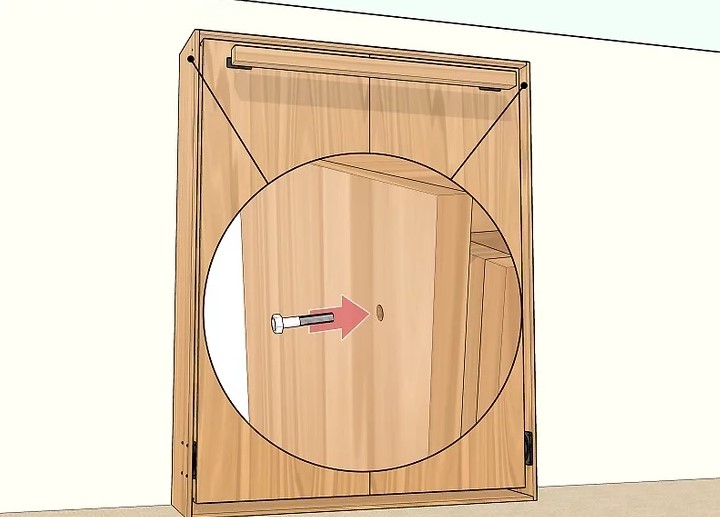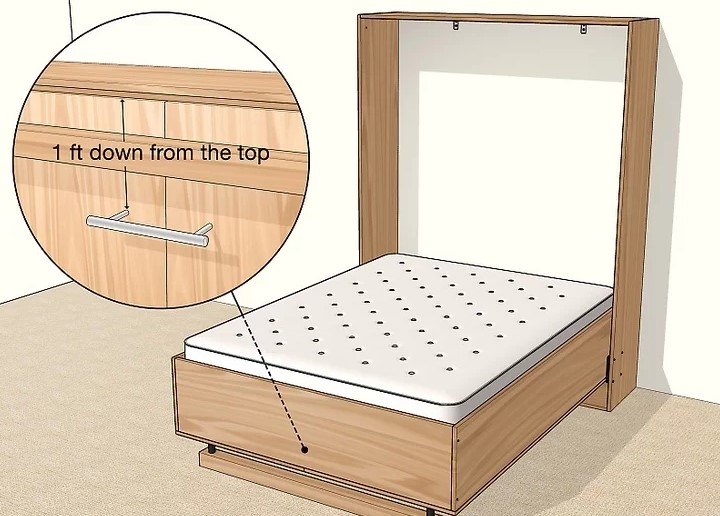 Матрасын хүрээг хананд суурилуулсан шүүгээний доод хэсэг буюу эргэдэг нугасруу шургуулна. Матрасын хүрээг шүүгээнд шургуулахад толгой хэсэг нь эргэдэг нугастай зэрэгцэнэ. Хүрээг толгойноос нь өргөж шүүгээний 2 талд байгаа эргэдэг нугасны зориулалтын хоногонд оруулан байрлуулна. Хоногны дагуу өрөмдөж нүх гарган өрөмдөж, эргэдэг нугасанд дагалдаж ирсэн боолтыг нүх болгонд хийж чангалаарай. Суурилуулахад хялбар хөдөлгөөнгүй байлгахын тулд хүрээг модоор бэхлээрэй.