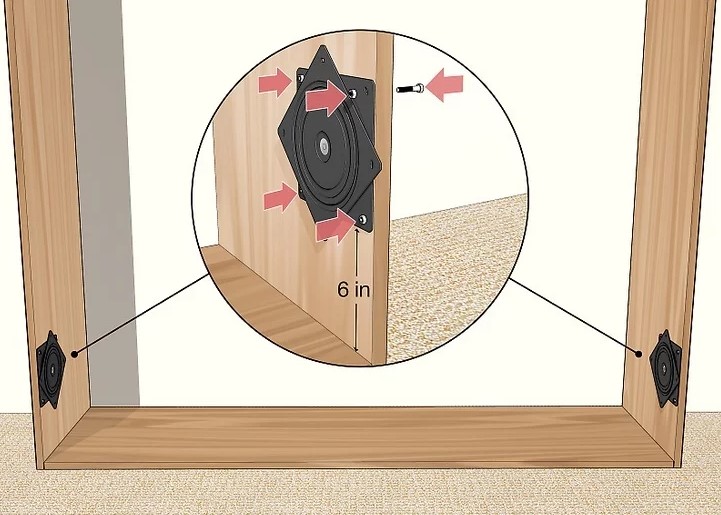 Эргэдэг нугаснуудыг шалнаас 6 инч (15 см) зайд шүүгээний дотор талд бэхлэнэ. Ихэнх эргэдэг механизмууд нь шүүгээнд бэхлэх зориулалттай 4 нүхтэй байдаг. Эргэдэг нугасуудыг шүүгээний доод хэсгээс 6 инч (15 см) зайд 2 хажуугийн урд ирмэгт тулган байрлуулна. Дараа нь бэхэлгээний нүх тус бүрээр мод руу өрөмдөнө. Нугастай дагалдаж ирсэн боолтыг шургуулж, хажуу талтай холбоно. Шүүгээний нөгөө талд мөн адил үйлдэнэ. Боолт бүрийг эрэг чангалах түлхүүрээр чангалж, найдвартай эсэхийг шалгаарай. Тоног төхөөрөмжүүд нь ашиглах зааварчилгаатай ирдэг тул хэрэглэж буй бүтээгдэхүүнийхээ зааврыг дагаж мөрдөөрэй.