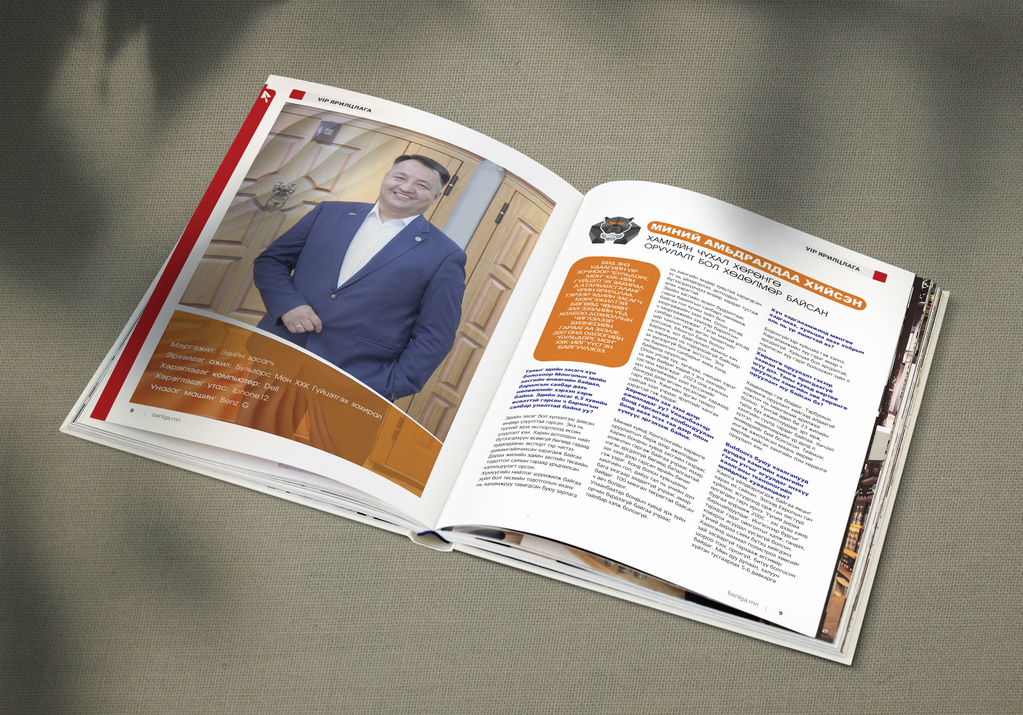 VIP ЯРИЛЦЛАГА: Бид энэ удаагийн VIP зочноор "Бульдорс Мон" ХХК-ийн захирал Д.Атарбаясгаланг урин ярилцлаа. Тэрээр эдийн засагч мэргэжилтэй бөгөөд чөлөөт зах зээлийн үед холбоо дохиоллын чиглэлээр бизнесийн гараагаа эхэлж, 2017 онд одоогийн "Бульдорс Мон" ХХК-ийг үүсгэн байгуулжээ.